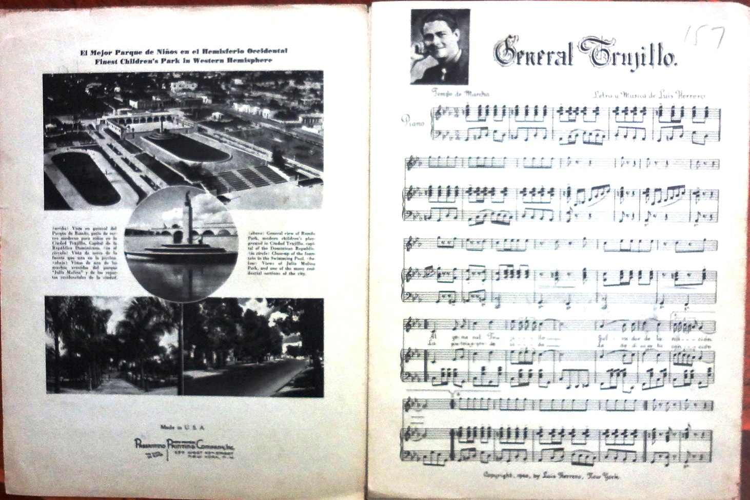 A leaflet with the words and music for a "Marcha" as a Souvenir of the Dominican Exhibit at the New York World Fair in 1940. Dimension is 9 by 12 inches with 6 pages.