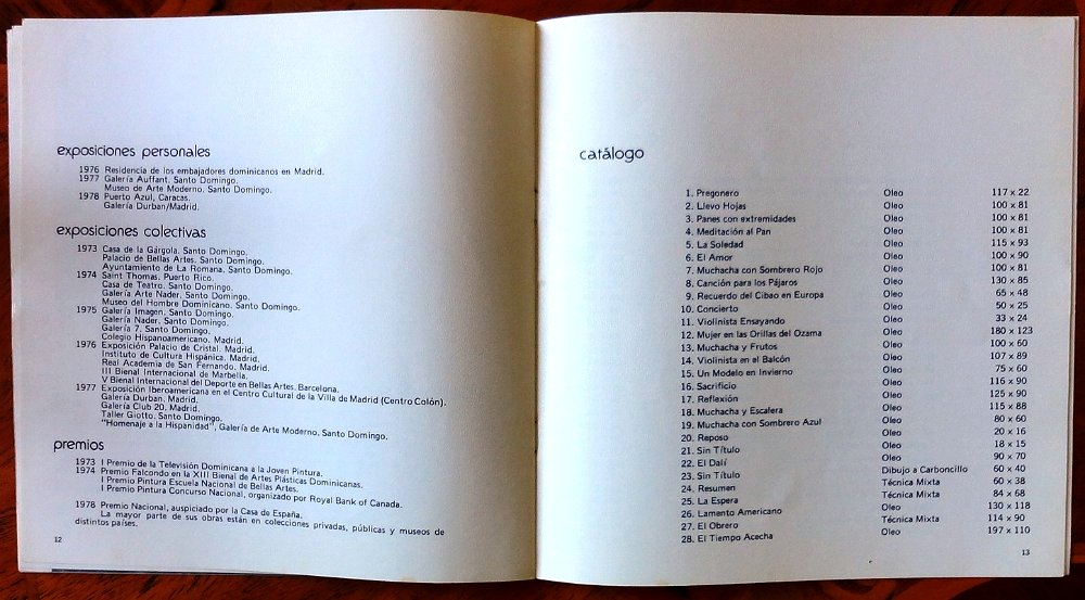 Exhibition of paintings in Madrid, Spain in the year 1978 with black and white pictures, biography, catalog of works, and 16 pages. Dimension is 8.5 by 8.5 inches. Published by "Galeria de Arte Moderno", and dated February 27 to March 27, 1979. Exposición de pinturas en Madrid, España en el año 1978 con fotos en blanco y negro, biografía, catálogo de las obras, y con 16 páginas. Dimensión es de 8,5 por 8,5 pulgadas. Publicado por la "Galería de Arte Moderno", y fechado del 27 febrero al 27 marzo de 1979.
