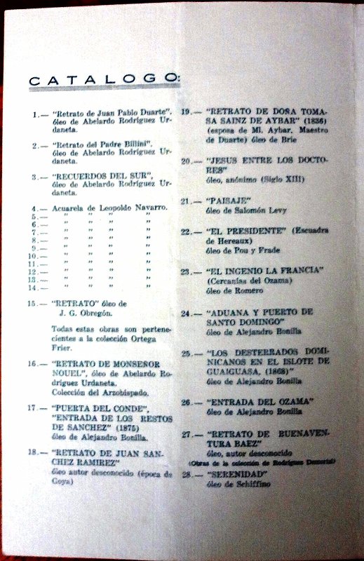 Catalogue in 4 pages with the woks of art of the Exhibition of Paintings from 1957 in Trujillo City. Catalogo de 4 páginas de las obras de la Exposición de Pinturas del 1957 en Ciudad Trujillo. Tamaño es 6.5 po 10 pulgadas.