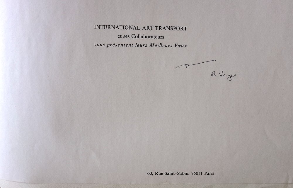 Excellent exposition booklet with an original abstract work of art. There is a 2 page inset with biographical information and venue of the event. Paper dimension is 10 by 11 inches. Signed in the lower right side. No frame. Excelente folleto de una exposición con una obra de arte original abstracta. Hay dos páginas con información biográfica y lugar de celebración del evento. Dimensión de papel es 10 por 11 pulgadas. Firmado en el ángulo inferior derecho. Sin marco.