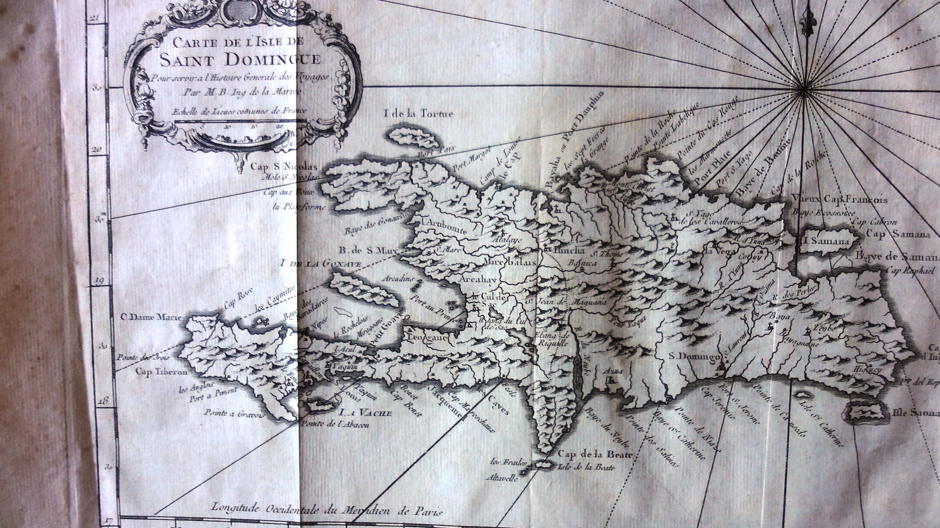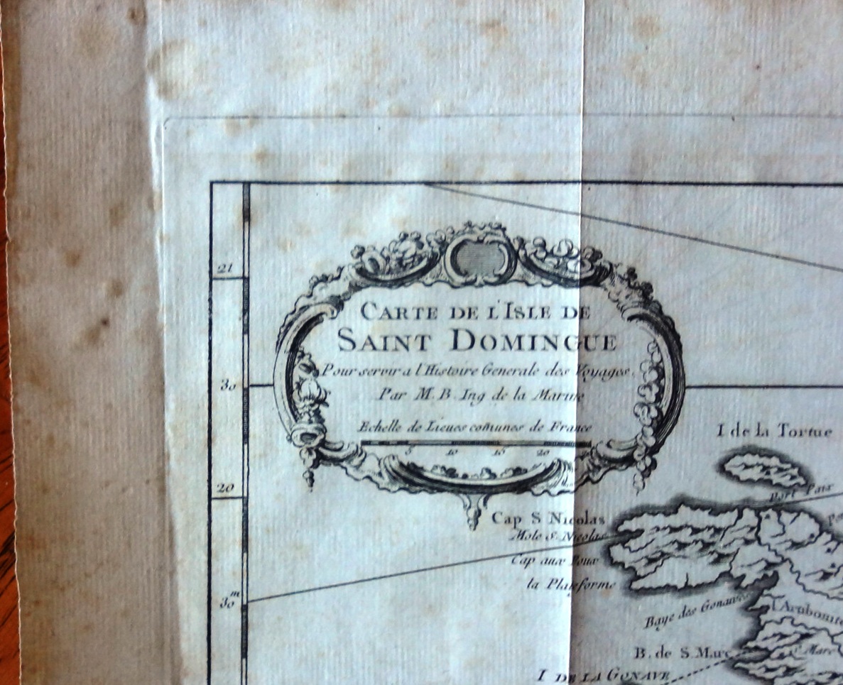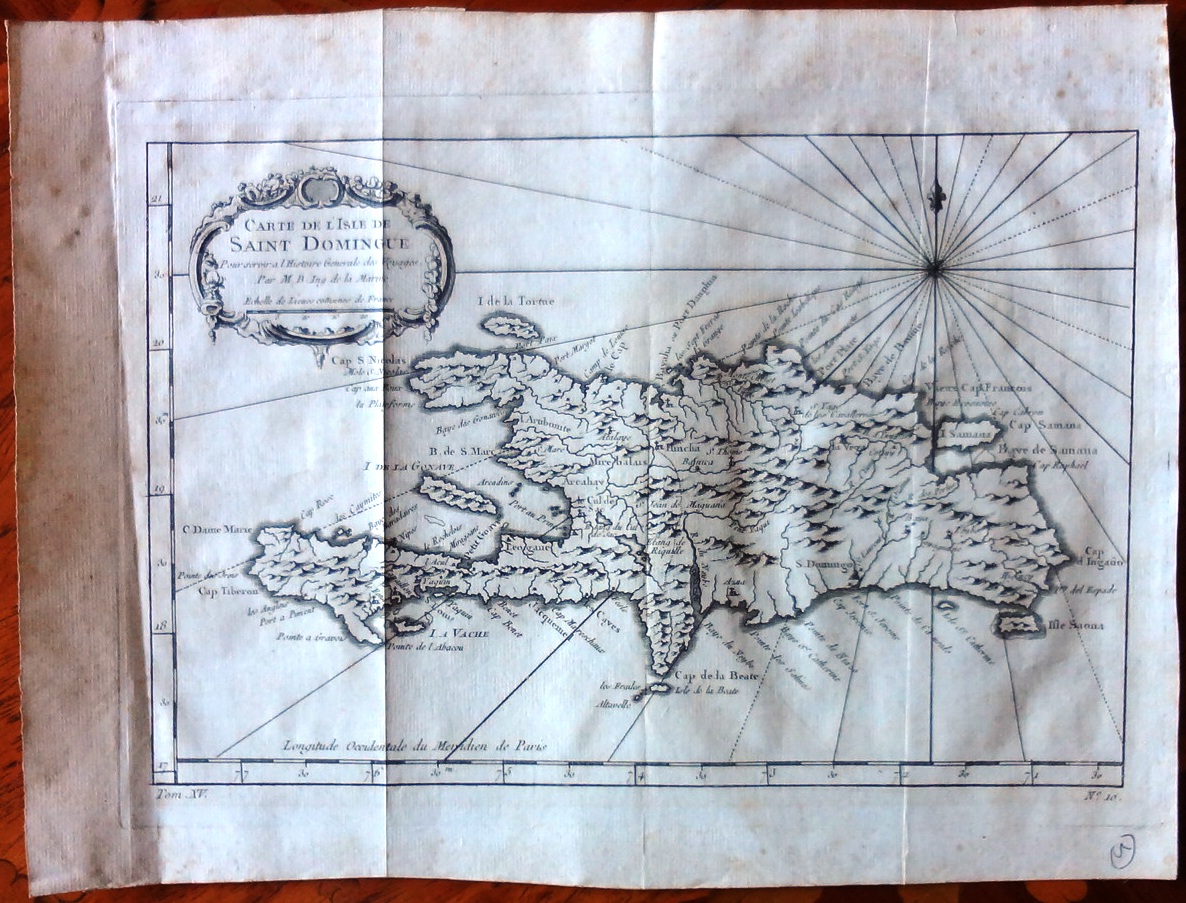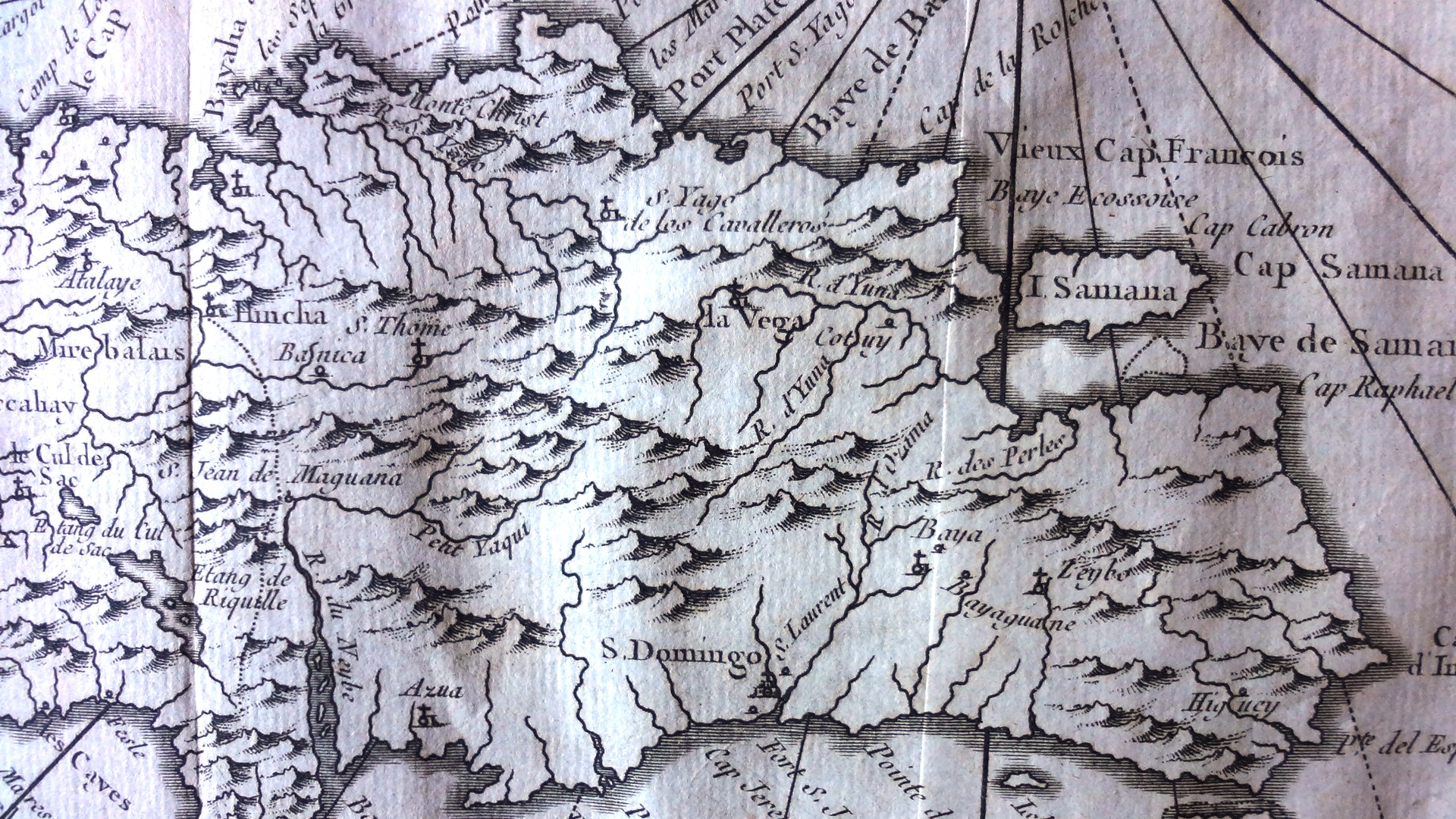 Engraved map of the Island of Hispaniola in the Caribbean Sea. Leaf measures 10.5 by 13 inches.