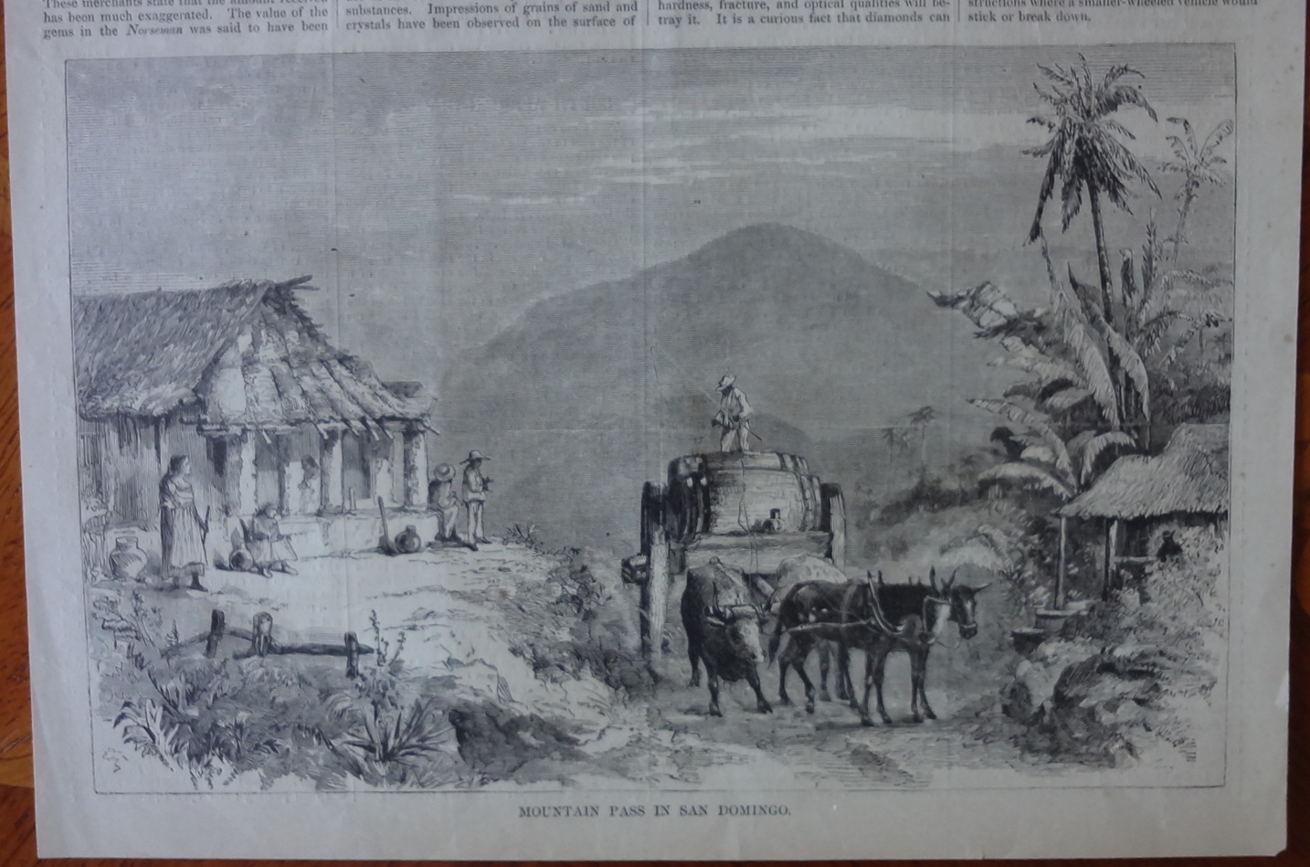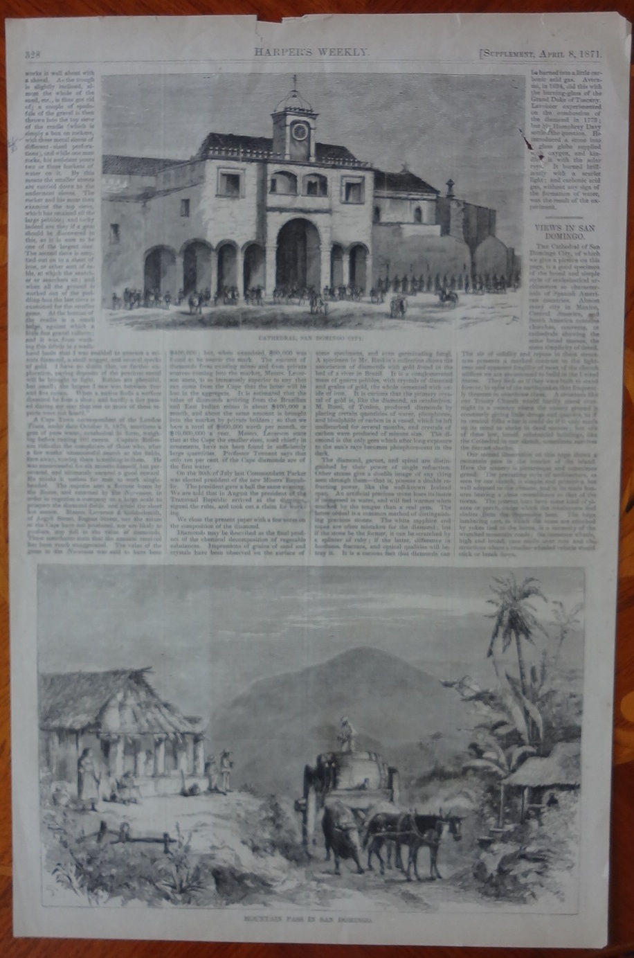 Página impresa en ambos lados del Semanario periódico Harper de fecha 8 de abril de 1871 con dos imágenes, una la Catedral, y la otra el paso de montaña de San Domingo en República Dominicana. Dimensión es 10 por 15.5 pulgadas.