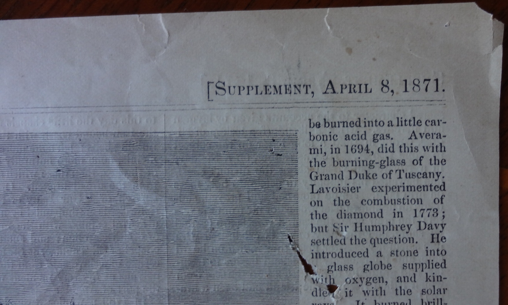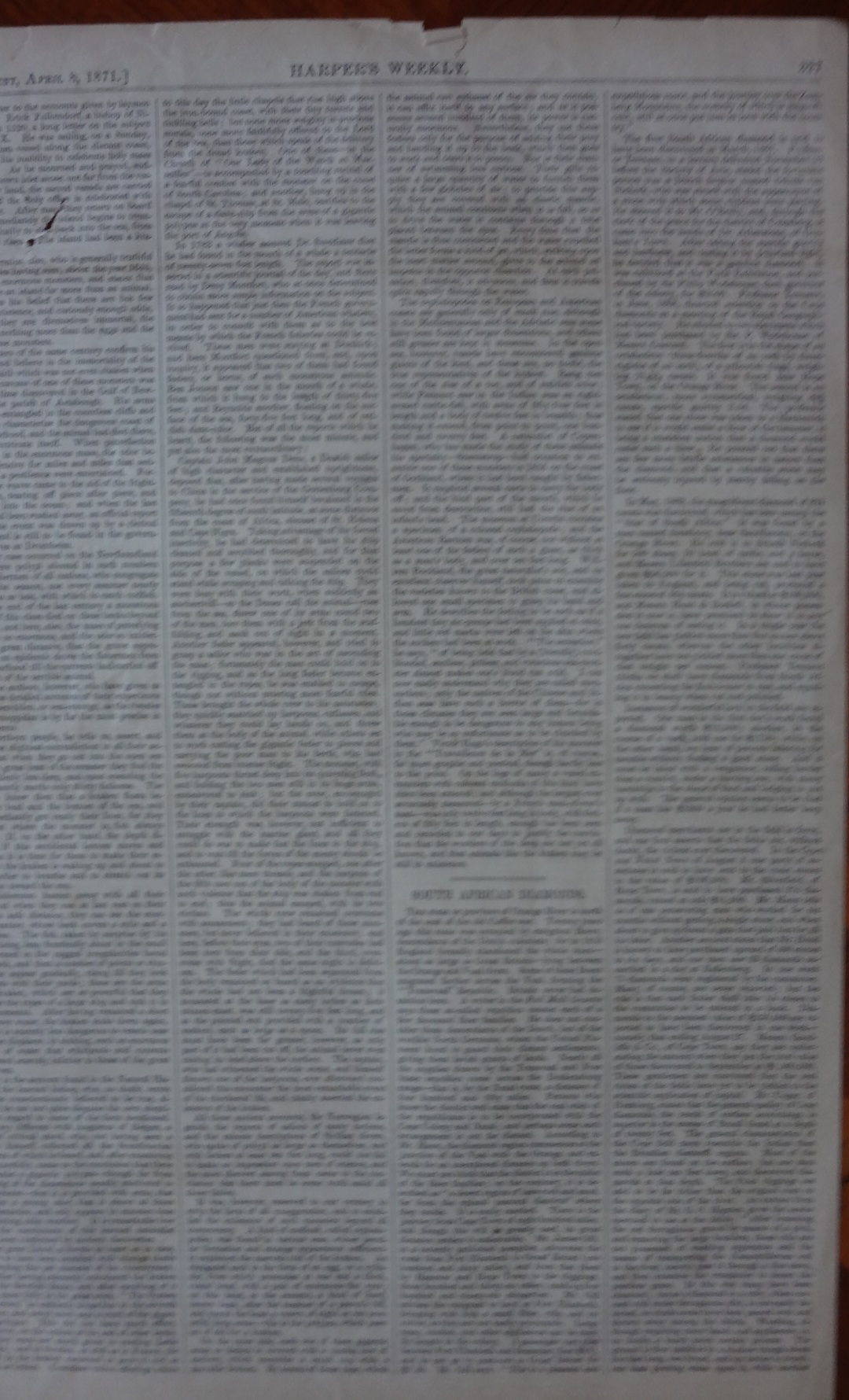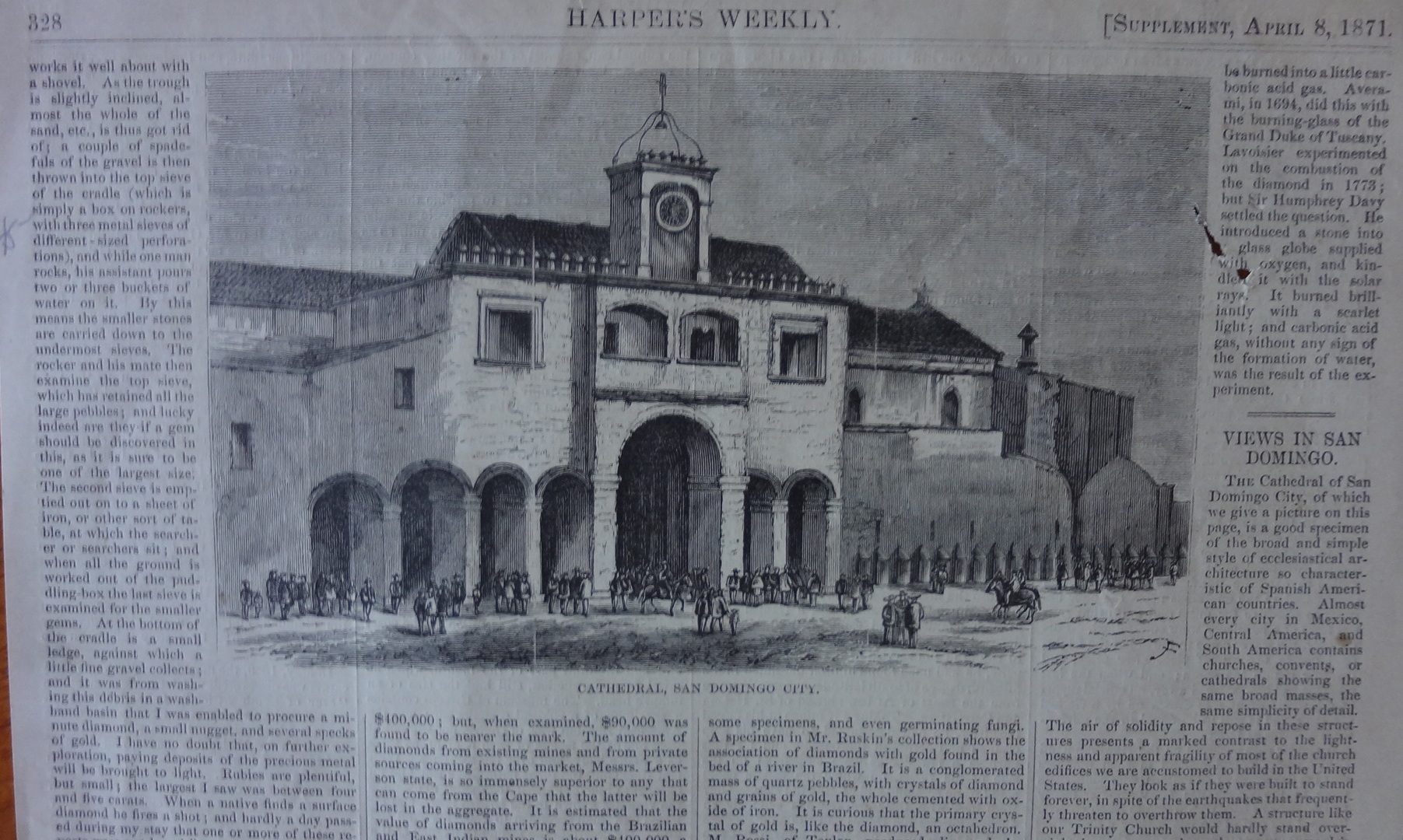 One page printed on both sides of the periodical publication Harper's Weekly dated April 8, 1871 with two pictures, one is the Cathedral and the other is a mountain pass in San Domingo in the Dominican Republic. Page dimension is 10 by 15.5 inches.