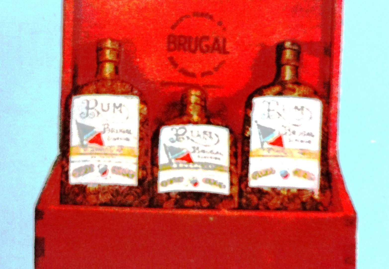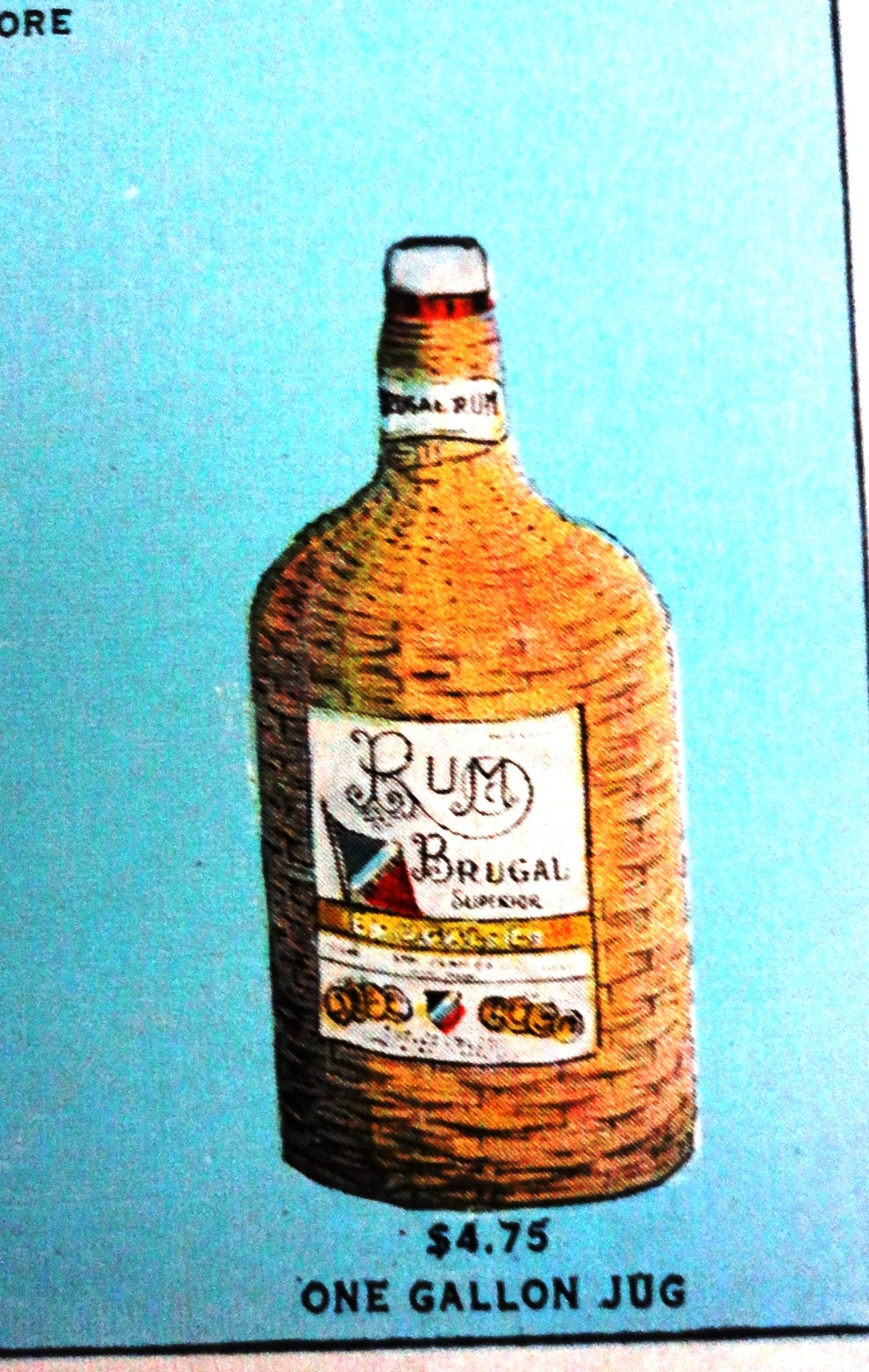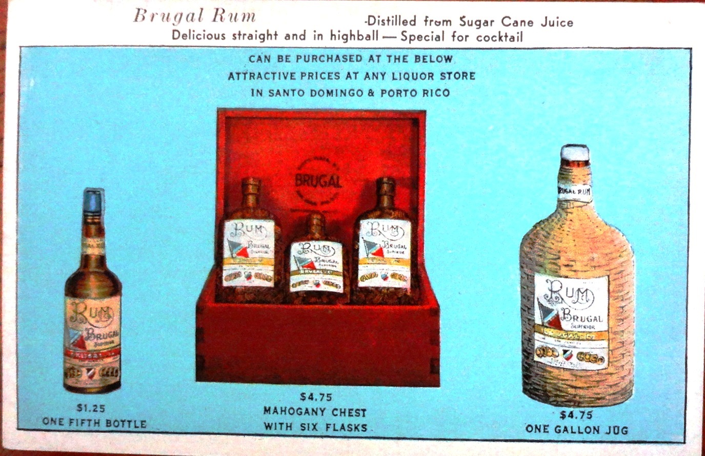 Postal a color con una presentación del ron Brugal de República Dominicana. Dimensión es 4 por 6.5 pulgadas.