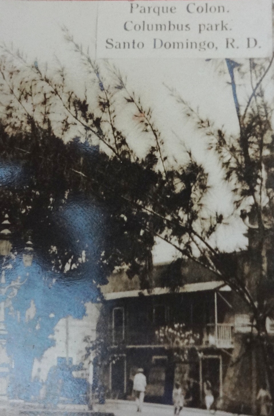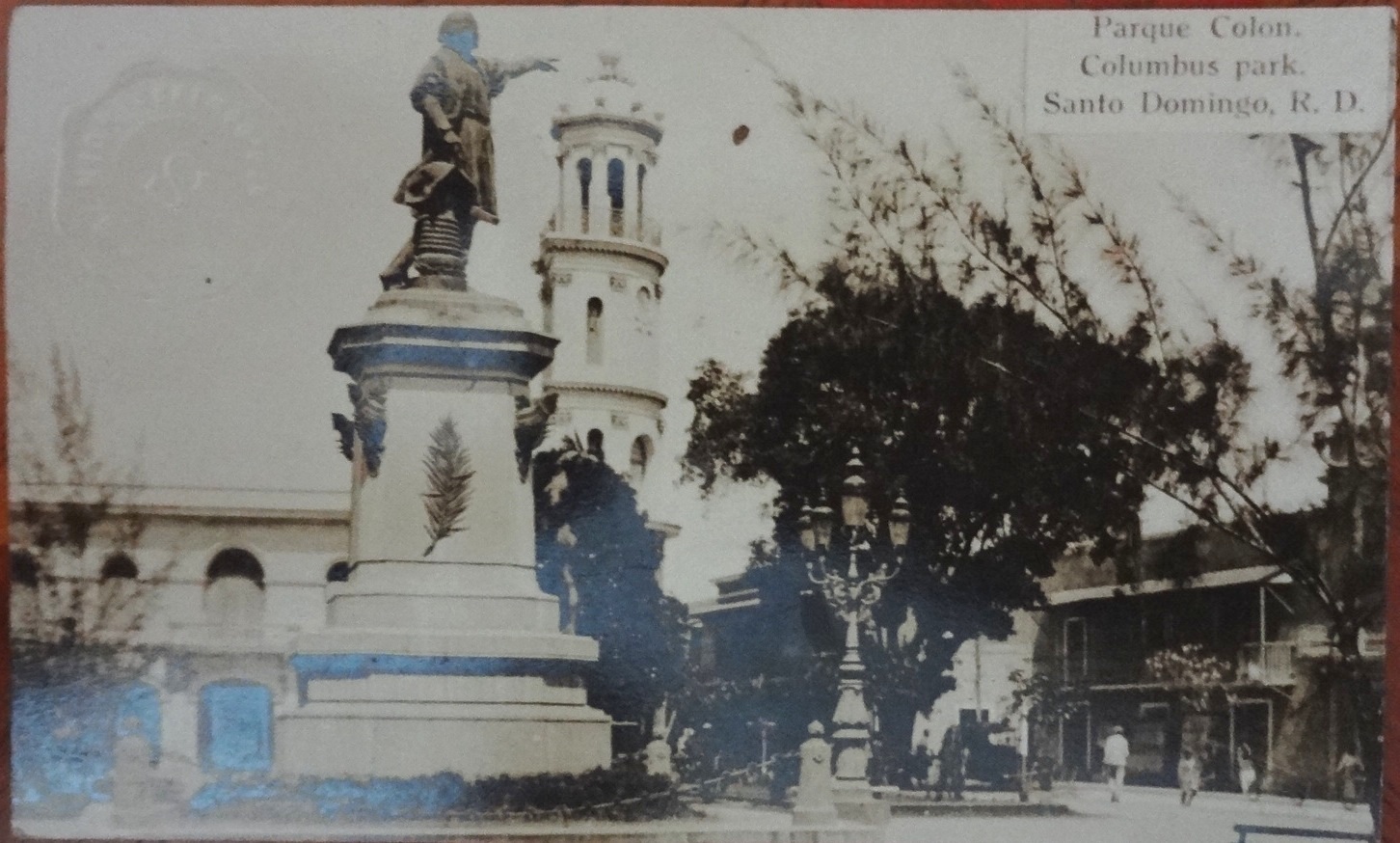 Postal en blanco y negro con el Parque Colon en el centro de la ciudad vieja de Santo Domingo. Dimensión es 3.5 por 6 pulgadas.