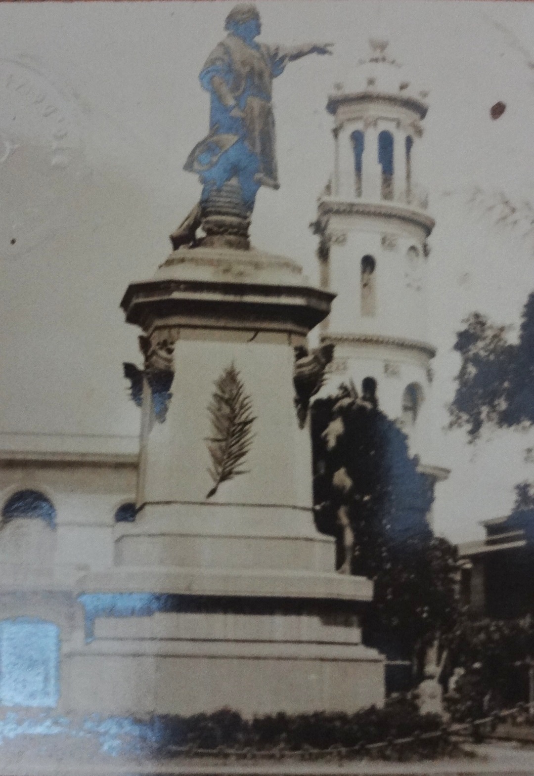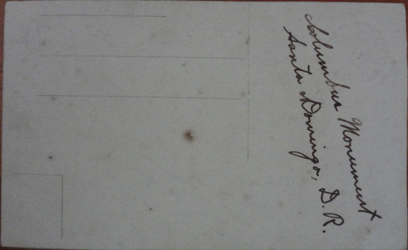 Black and white post card with the Colon Park in the center of the old city of Santo Domingo. Dimension is 3.5 by 6 inches.