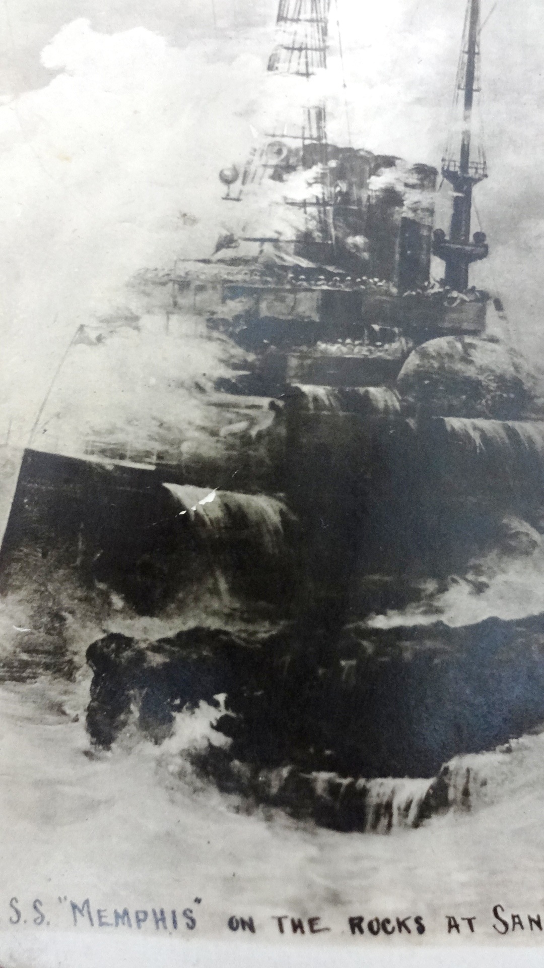 Black and white post card with the USS Memphis stranded at the rocks in San Domingo. Dimension is 3.5 by 5.5 inches.