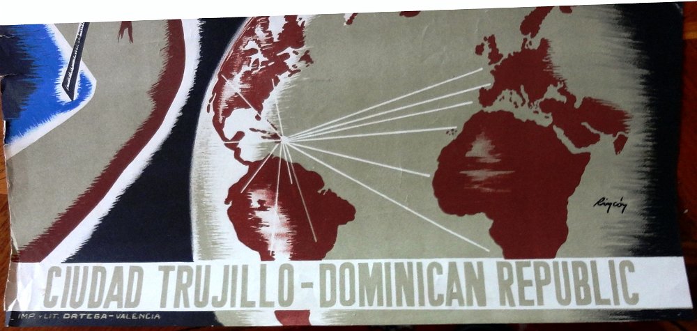 Trujillo Poster for the event organized by the Dominican Government with the title "The Free World and Brotherhood Fair United for Peace and Progress" celebrated or held in Ciudad Trujillo in the year 1955-1956, during the regime of Rafael Leonidas Trujillo Molina. Created by Rincon and Imp. Lit. Ortega Valencia. Paper dimension is 13 by 20 inches. En español Cartel en papel para el evento organizado por el Gobierno Dominicano con el título "El mundo libre y Cofradía de Feria Unidas para la Paz y el Progreso" celebrada en Ciudad Trujillo en el año 1955-1956, durante el régimen de Rafael Leonidas Trujillo Molina. El cartel fue creado por Rincón e Imp.-Lit. Ortega Valencia. Dimensión del papel es 13 por 20 pulgadas.
