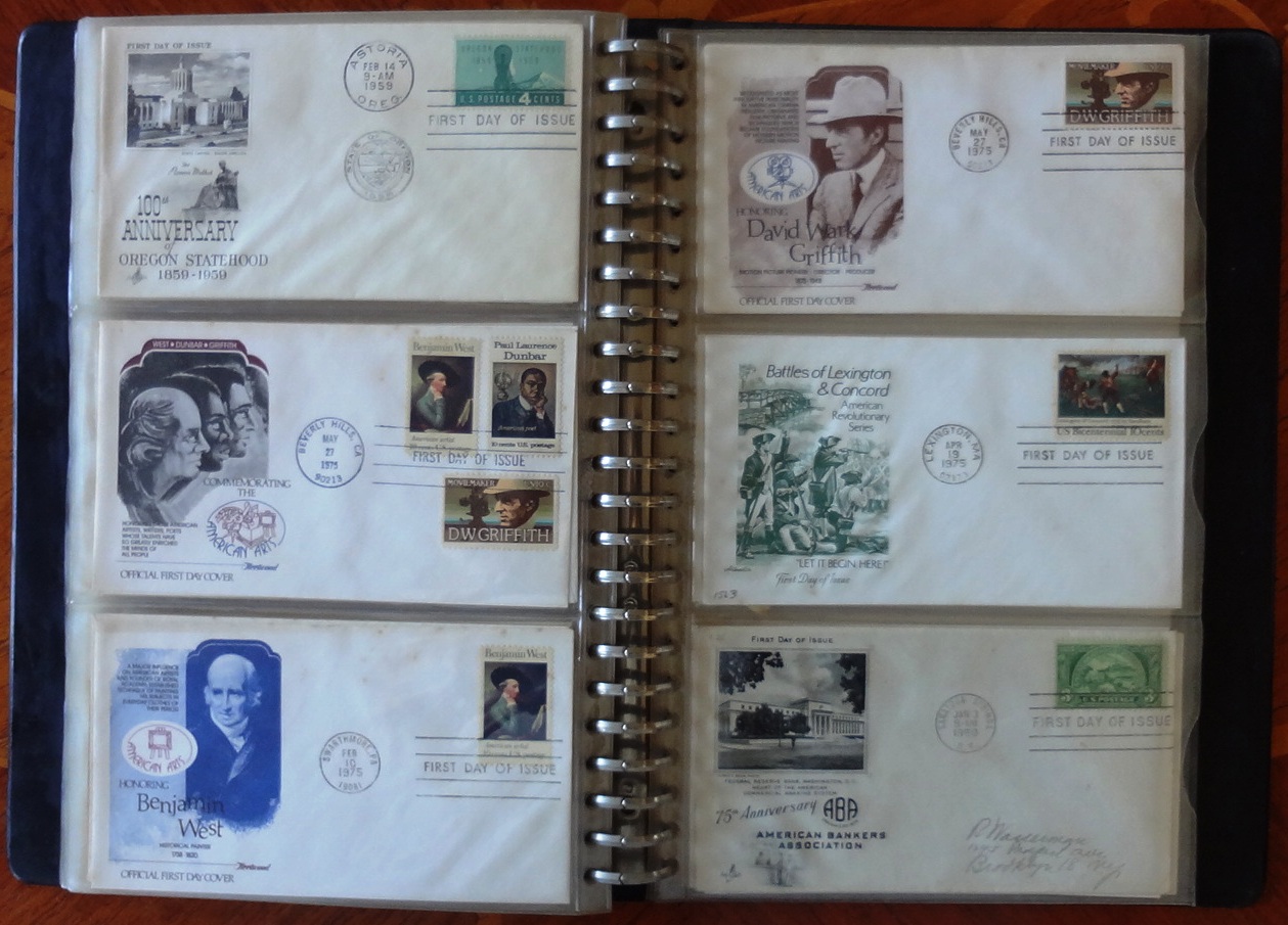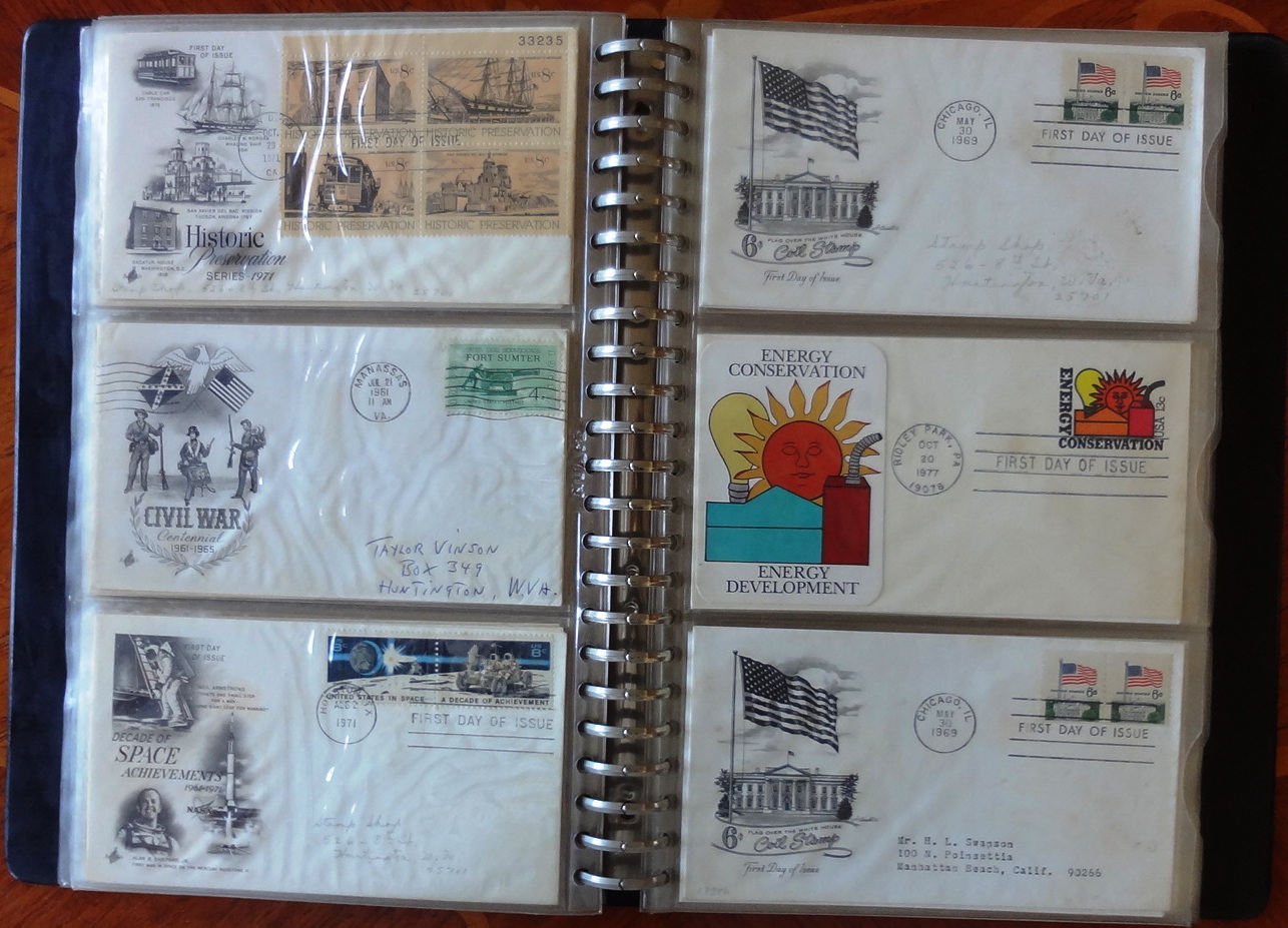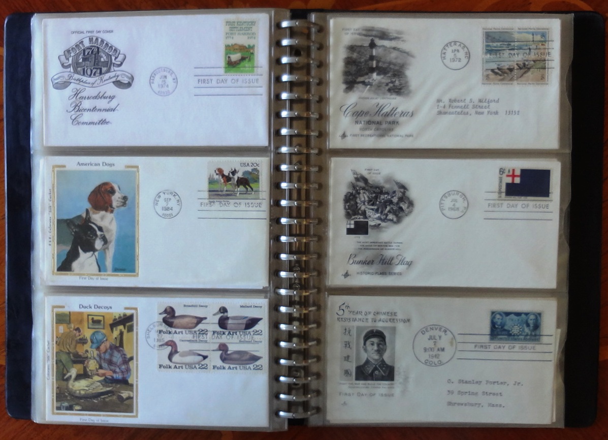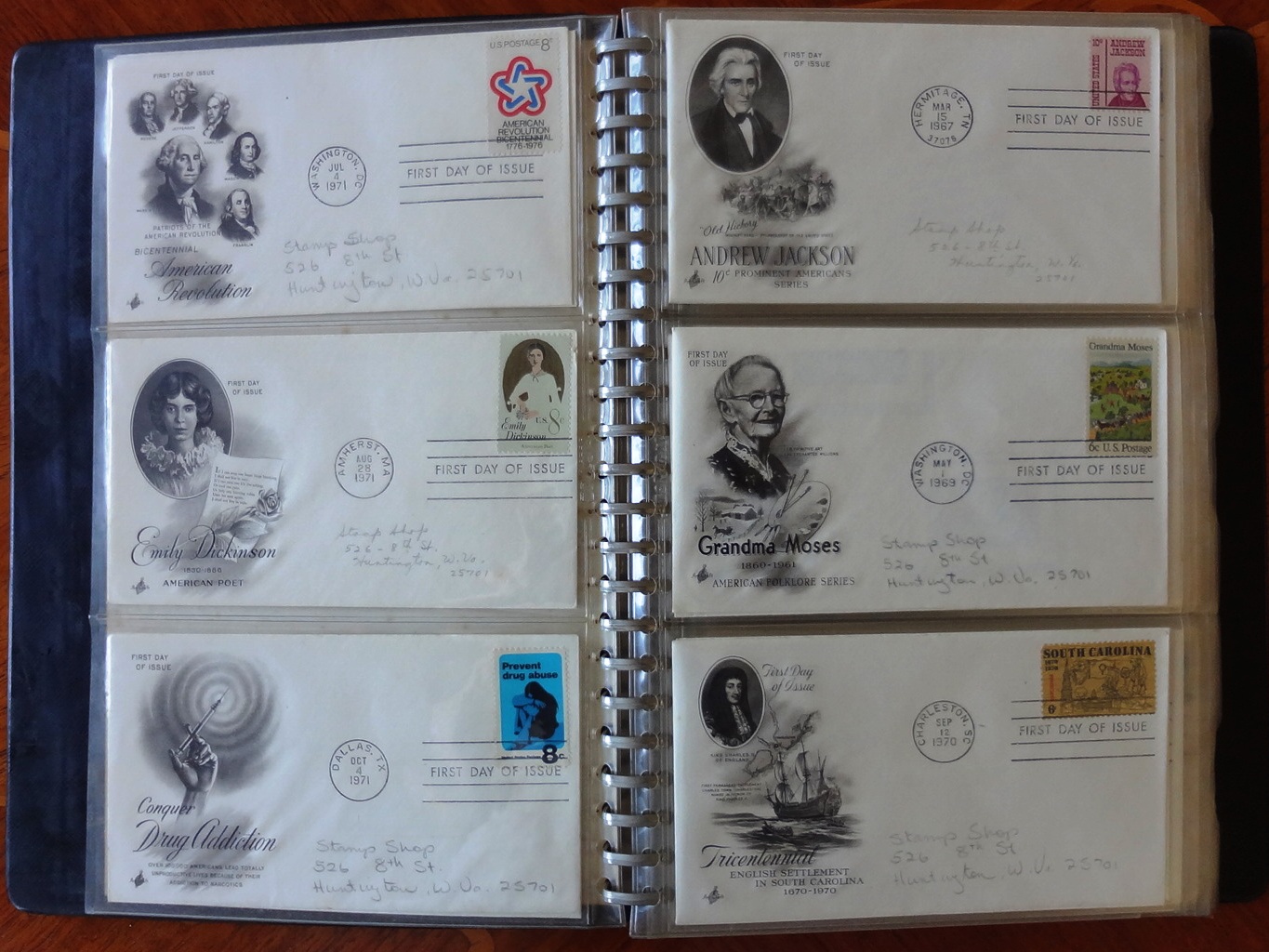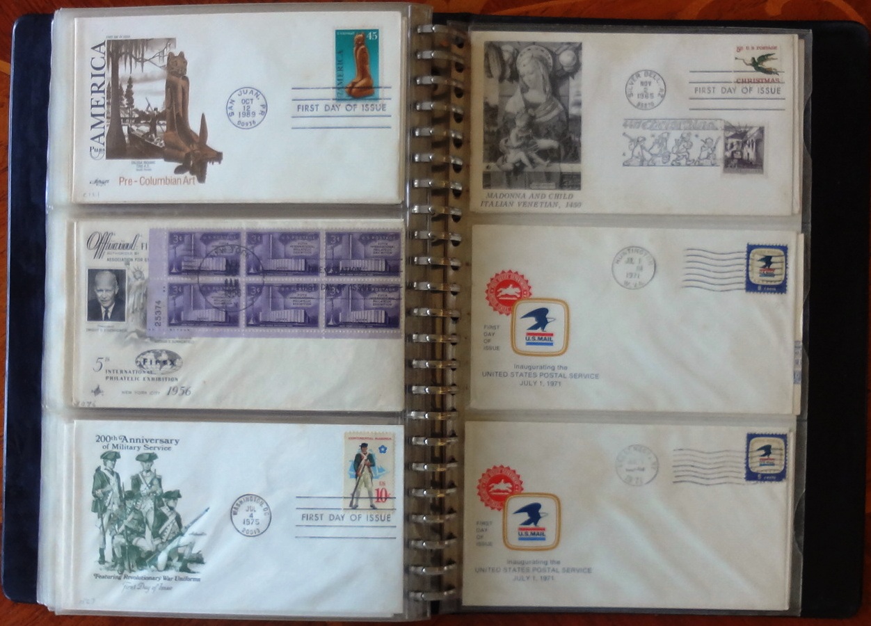 Colección de sobres del Primer Día de Emisión de Estados Unidos. Hay 84 cubiertas a partir del año 1971 en adelante. En una cubierta del álbum con tapas negras y respaldo negro, de plástico transparente protegidos con cubiertas y 3 por lado. La mayoría de las FDC con direcciones, algunos sin dirección. La mayoría tienen sellos, algunos en color.