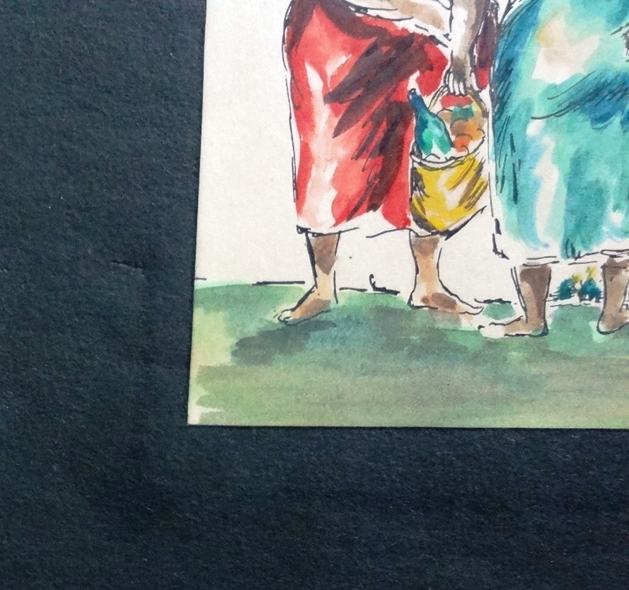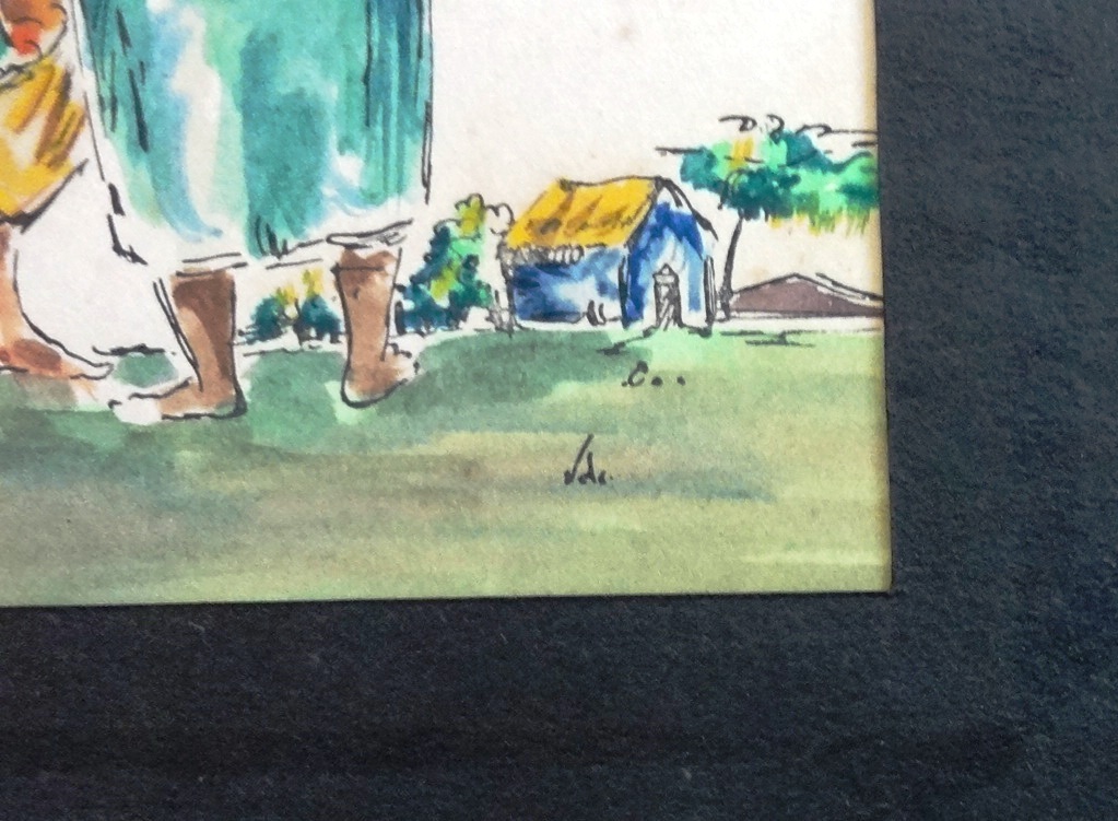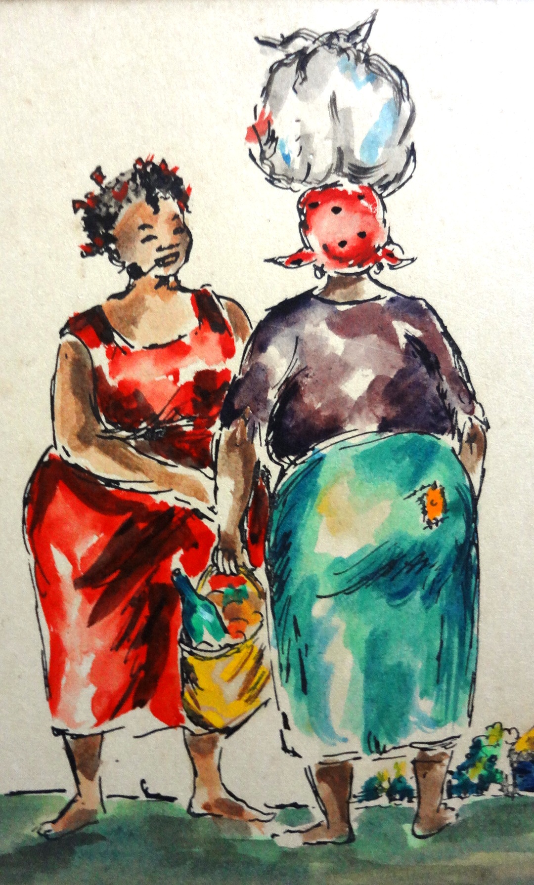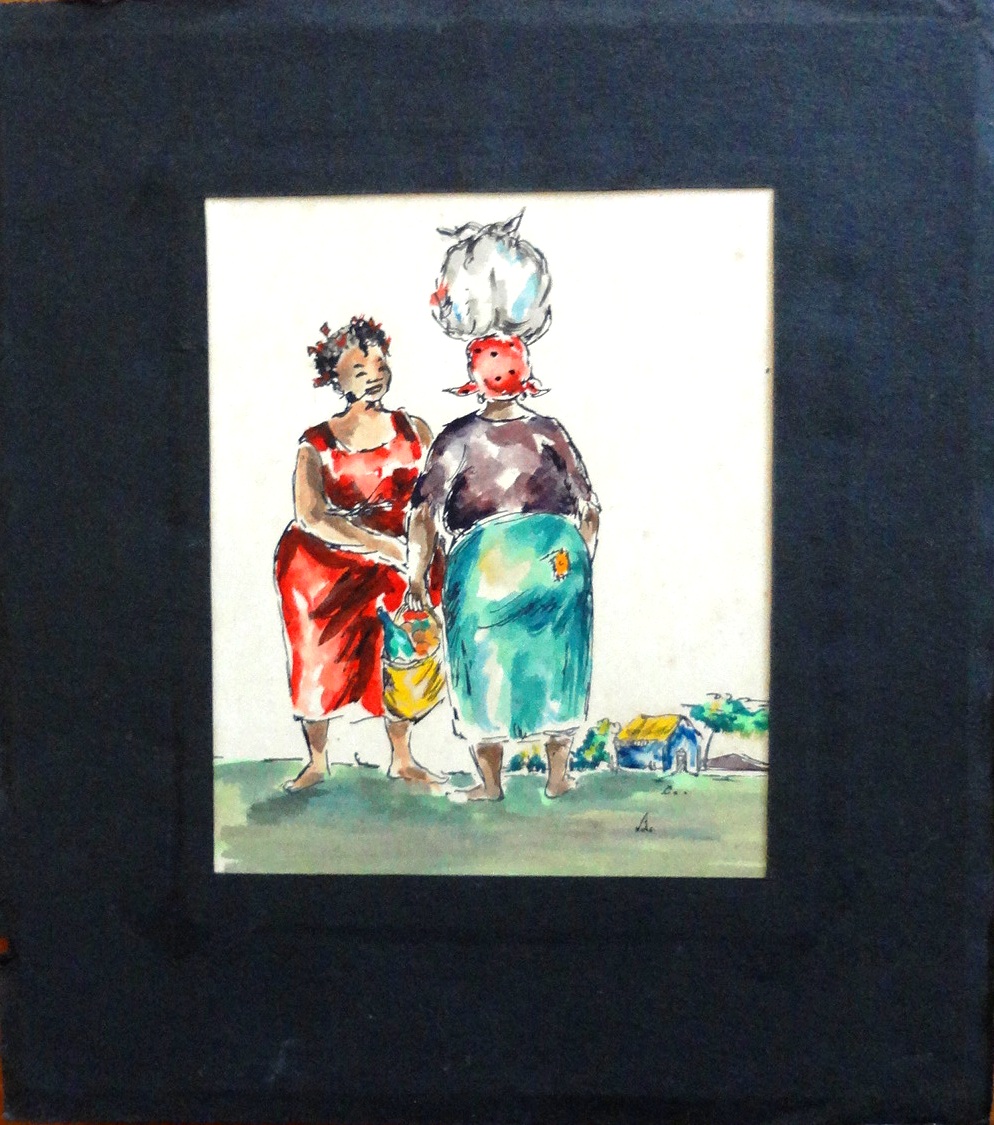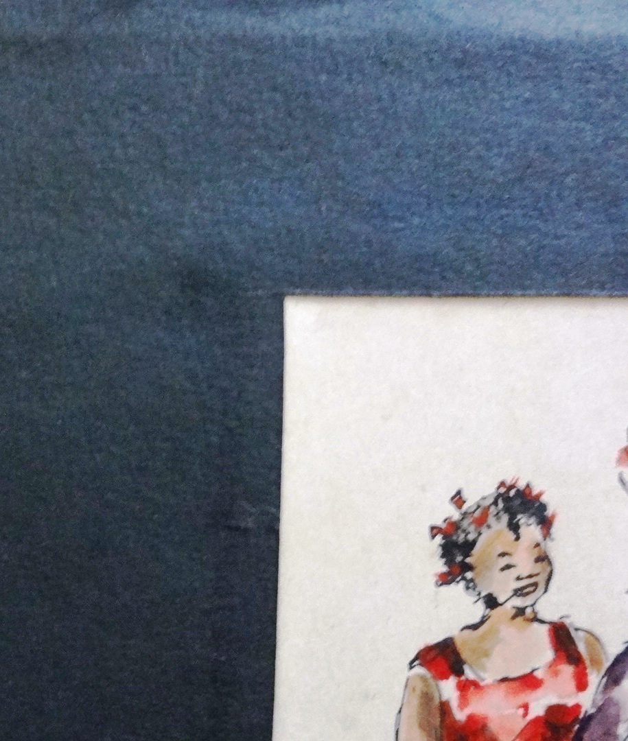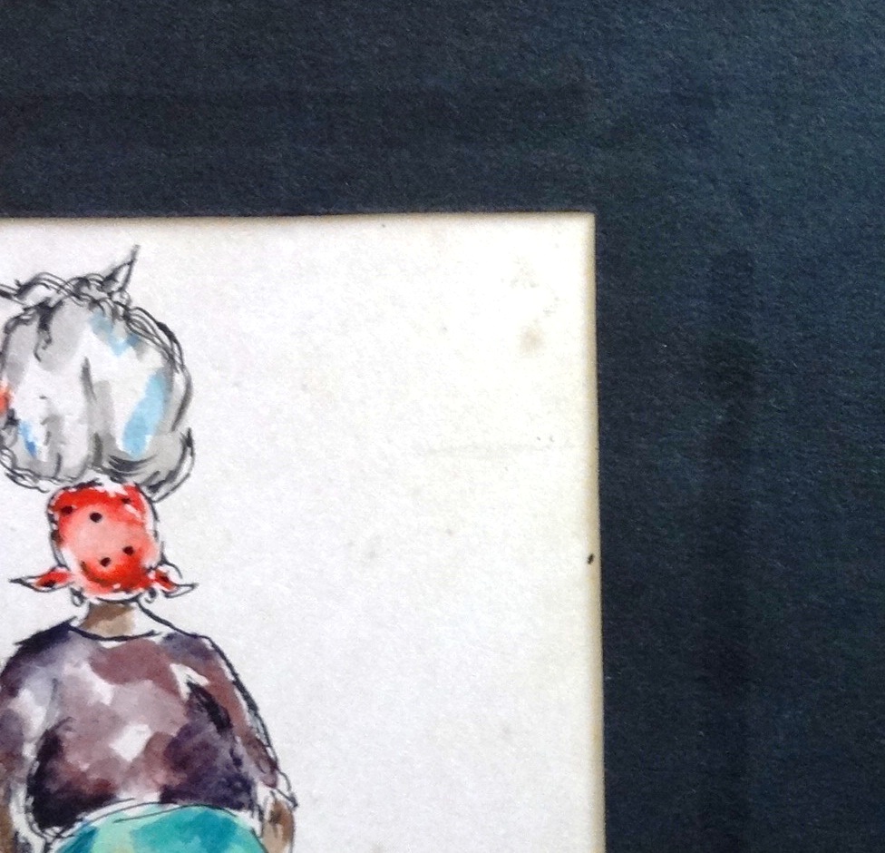 Watercolor and ink on paper with two local women. Dimension is 4.5 by 6 inches. Signed in the lower right corner. No frame. Acuarela y tinta sobre papel con dos…