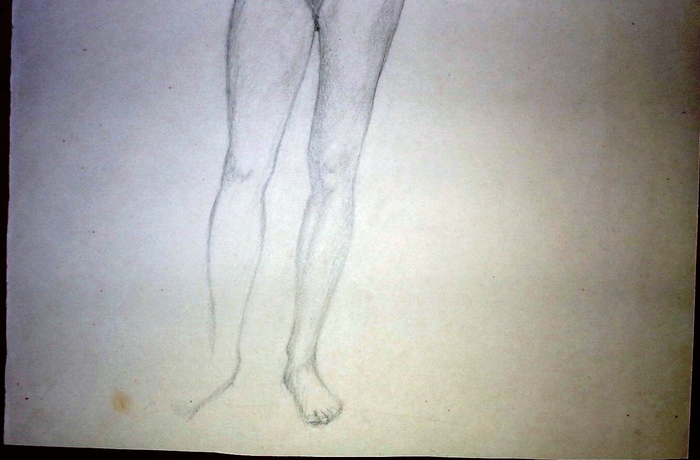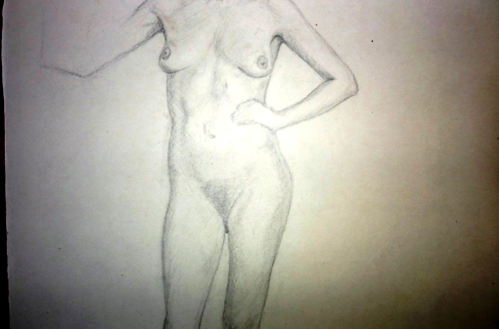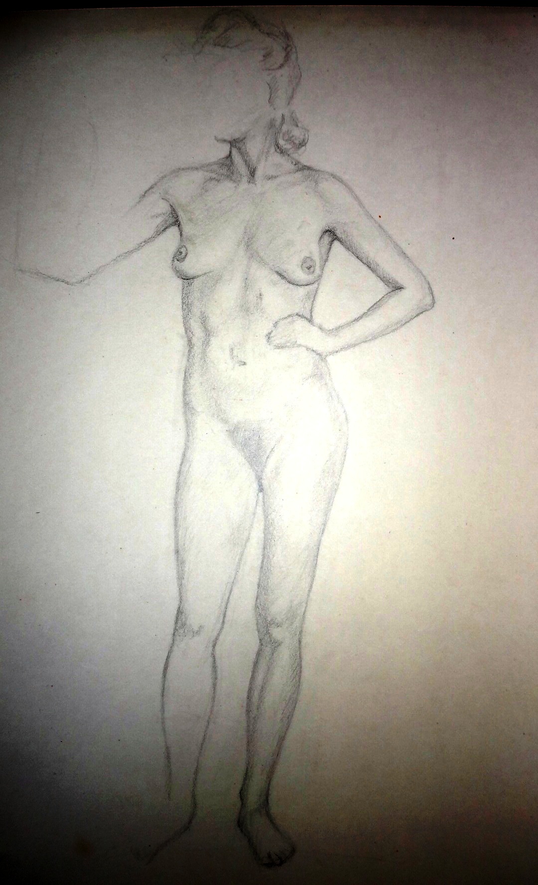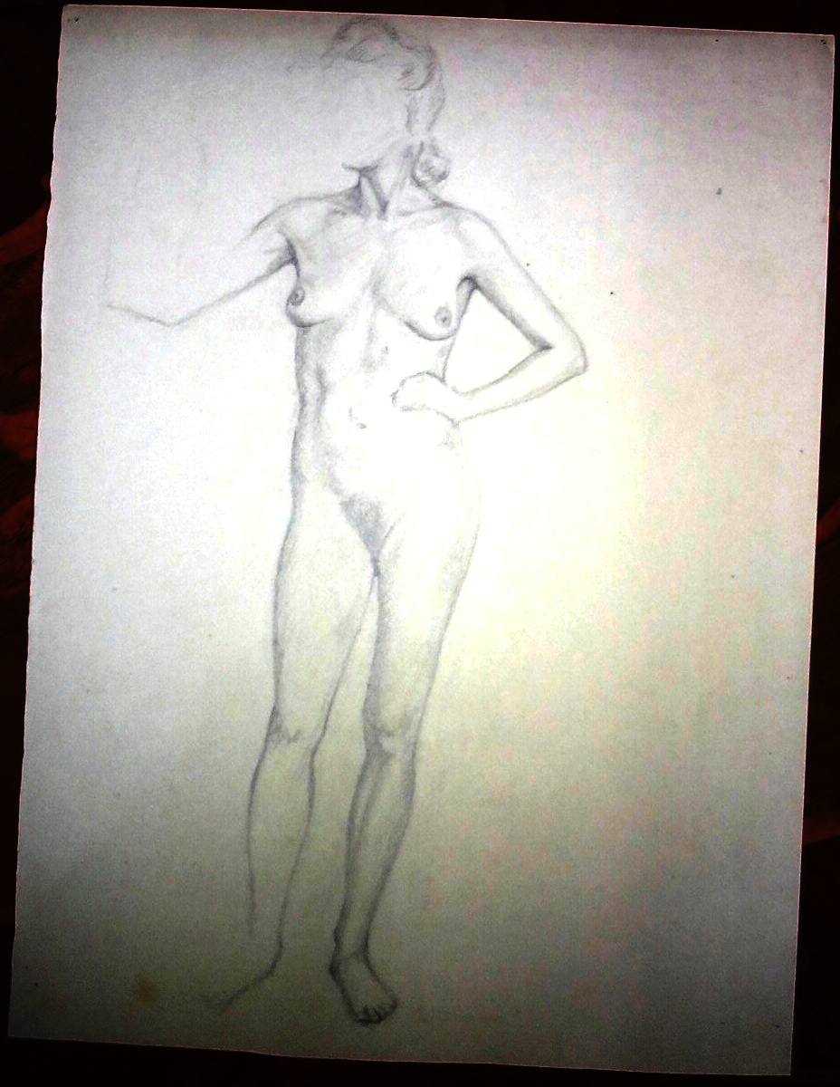 Sketch on paper with a nude women with her hands in the waist. Paper dimensions are varied in size. Not signed and dated. No frame.