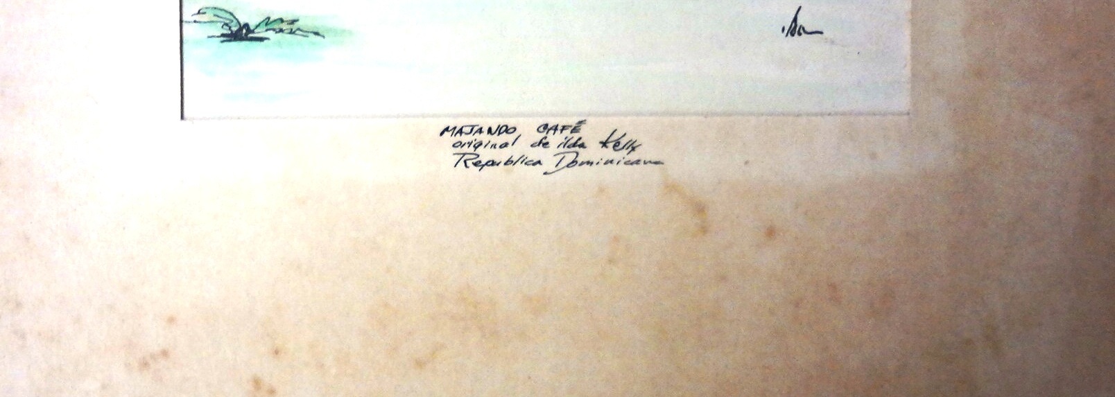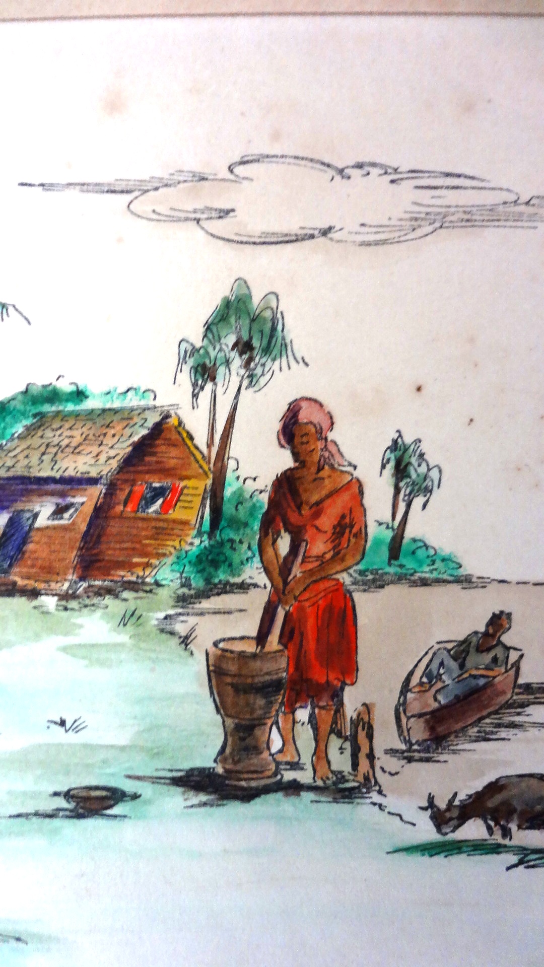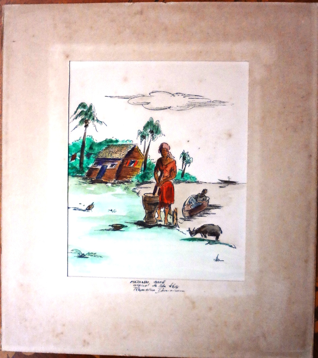 Pintura coloreada sobre papel con una escena tipica rural de la ciudad de Santo Domingo. Dimension del papel es 5 por 6 pulgadas. Firmada y titulada en el centro. Sin marco.
