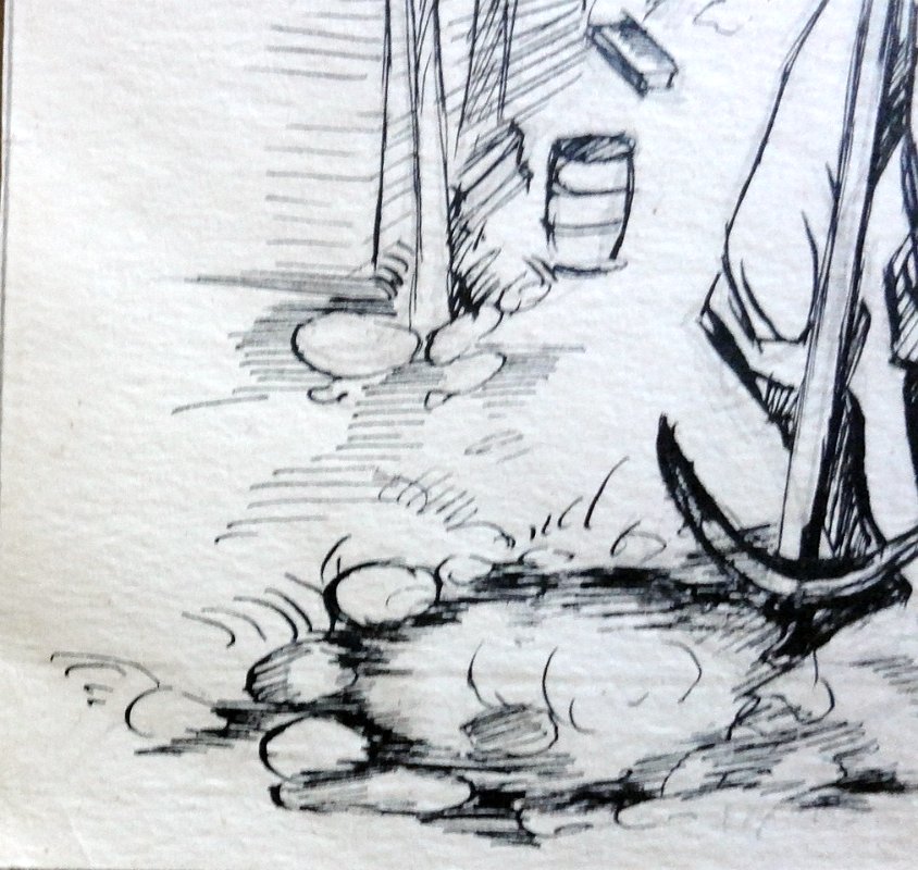 DSC01568 Black and white ink on paper with an eye looking at a working man. Dimension is 5.5 by 7.5 inches. No frame. Tinta sobre papel en blanco y negro con un ojo mirando un hombre trabajando. Tamaño es 5.5 por 7.5 pulgadas. Sin marco.
