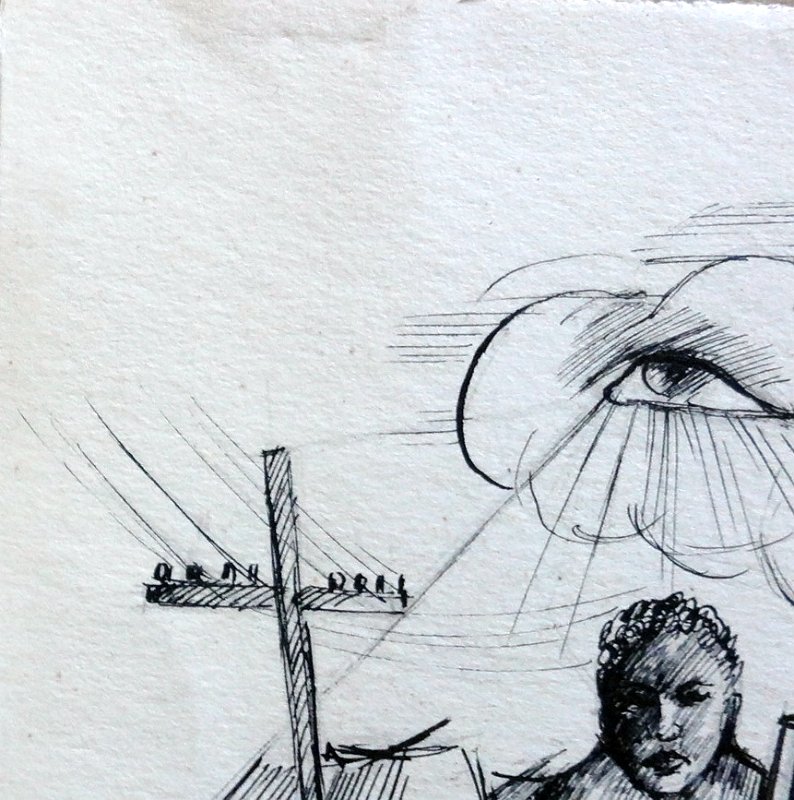 DSC01571 Black and white ink on paper with an eye looking at a working man. Dimension is 5.5 by 7.5 inches. No frame. Tinta sobre papel en blanco y negro con un ojo mirando un hombre trabajando. Tamaño es 5.5 por 7.5 pulgadas. Sin marco.