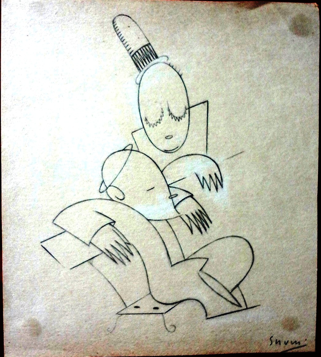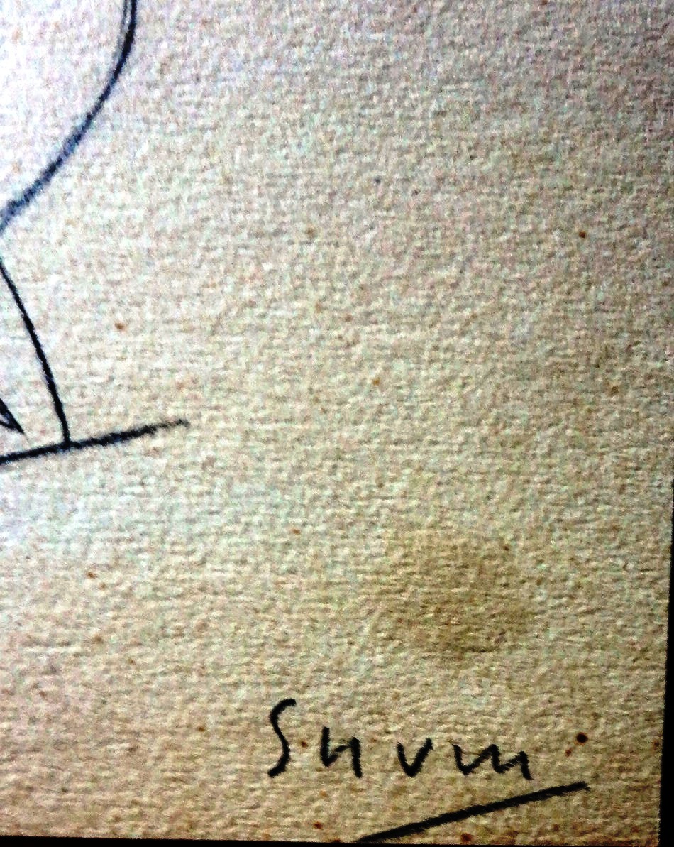 Original sketch drawing in pencil with 2 boys and their father. Paper dimension is 9 by 9.5 inches. Signed in pencil in the lower right side. No frame.