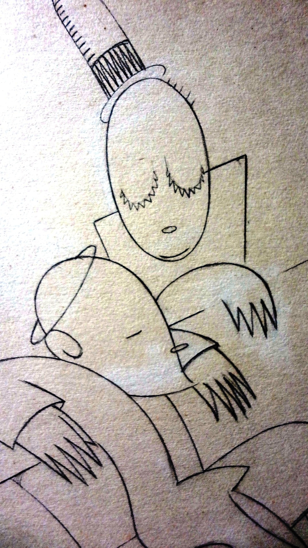 Dibujo en boceto original a lápiz con un papa y sus dos hijos. Dimensión del papel es 9 por 9.5 pulgadas. Firmado en lápiz del lado inferior derecho. Sin marco.