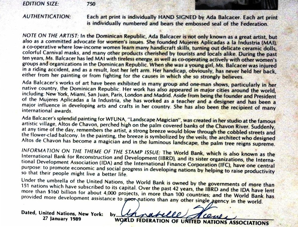 DSC00776 Original print in commemoration of the United Nations. Paper size is 8.5 by 11 inches. Signed and dated 1989 in pencil in the lower right side. Numbered 205/750. No frame. Impreso original en commemoración de las Naciones Unidas. El tamaño del papel es 8.5 por 11 pulgadas. Firmado con lápiz y fechado 1989 en el lado derecho inferior. Numerado 205/750. Sin marco.