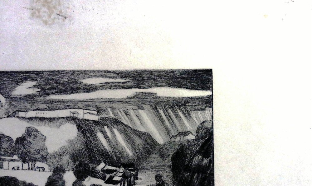 Original etching print with a tropical landscape in the Island of Santo Domingo. Paper dimension is 6.5 by 9.5 inches. No frame. Aguafuerte original con un paisaje tropical en la Isla de Santo Domingo. Dimensión del papel es 6.5 por 9.5 pulgadas. Sin marco.