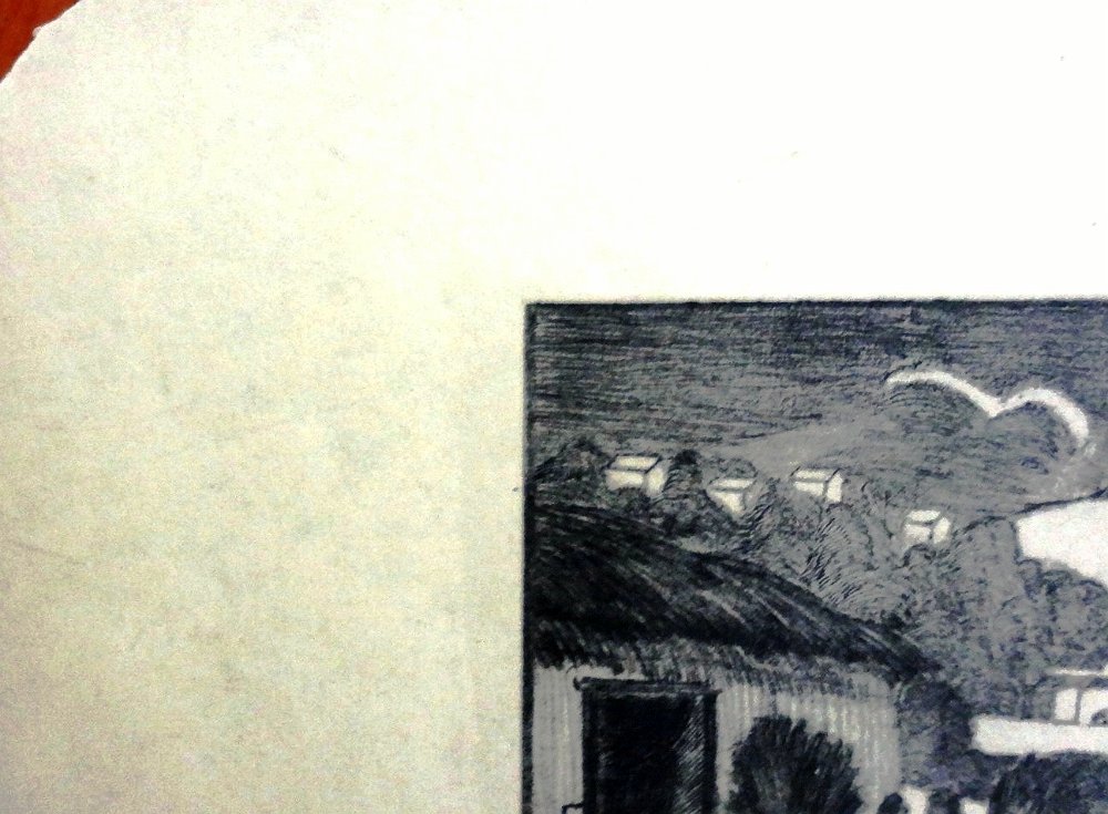 Original etching print with a tropical landscape in the Island of Santo Domingo. Paper dimension is 6.5 by 9.5 inches. No frame. Aguafuerte original con un paisaje tropical en la Isla de Santo Domingo. Dimensión del papel es 6.5 por 9.5 pulgadas. Sin marco.