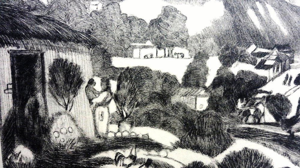 Original etching print with a tropical landscape in the Island of Santo Domingo. Paper dimension is 6.5 by 9.5 inches. No frame. Aguafuerte original con un paisaje tropical en la Isla de Santo Domingo. Dimensión del papel es 6.5 por 9.5 pulgadas. Sin marco.