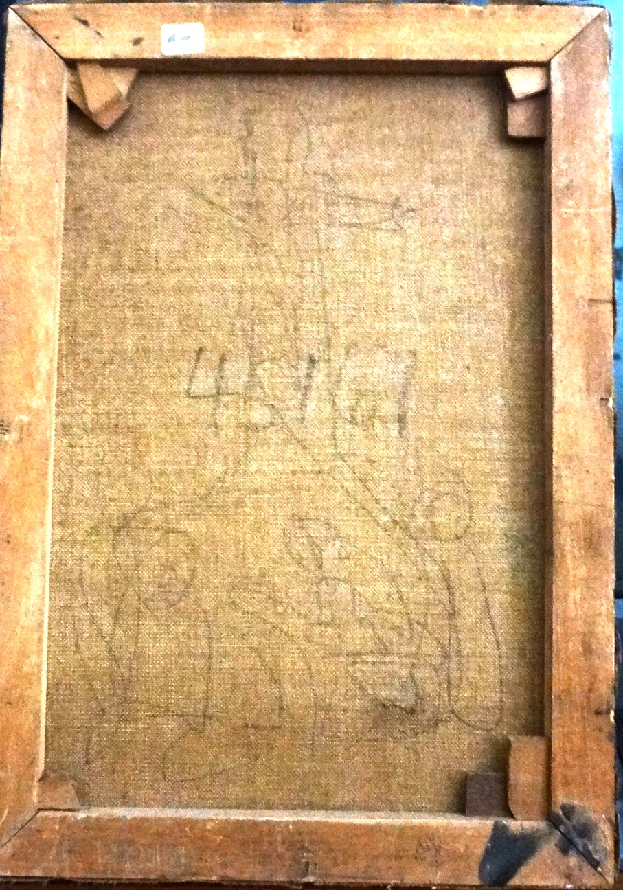 Excellent expressionist art. Medium: Oil on canvas. Height is 20 inches and width is 14 inches. Condition Note: Minor wear and tear. Signed in the upper left side in red.