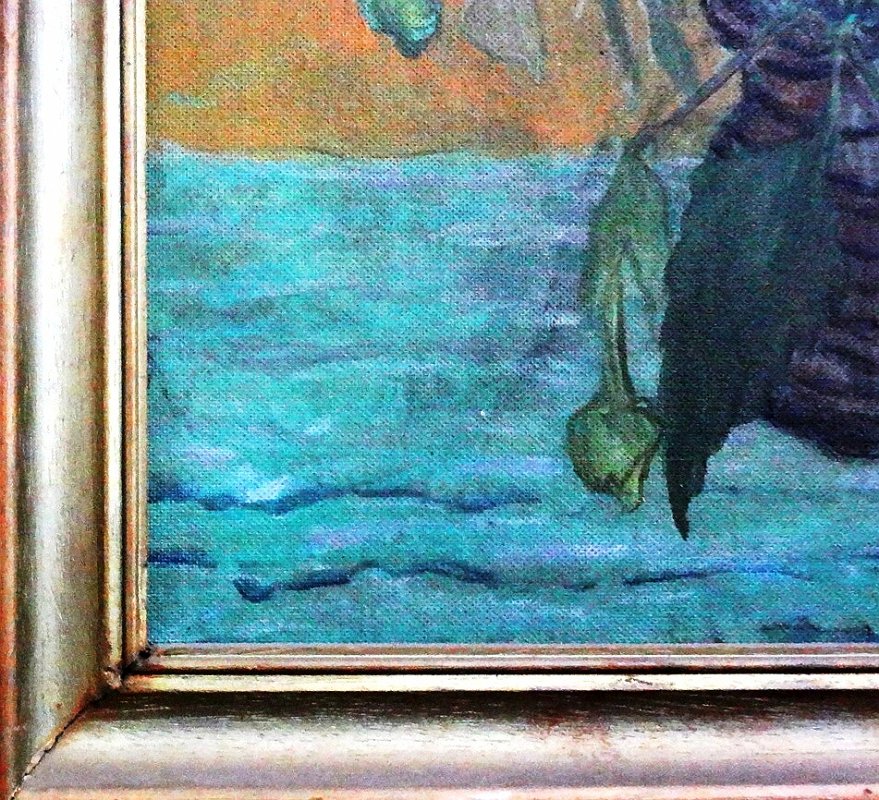 Beautiful oil on board still life with potted yellow sun flowers. Board dimension is 18 by 22 inches. Signed in black in the lower right side. No frame. Oleo sobre carton con naturaleza muerta de unas flores del sol amarillas en un jarron. Dimensión del carton es 18 por 22 pulgadas. Firmado en el lado inferior derecho en negro. Sin marco.