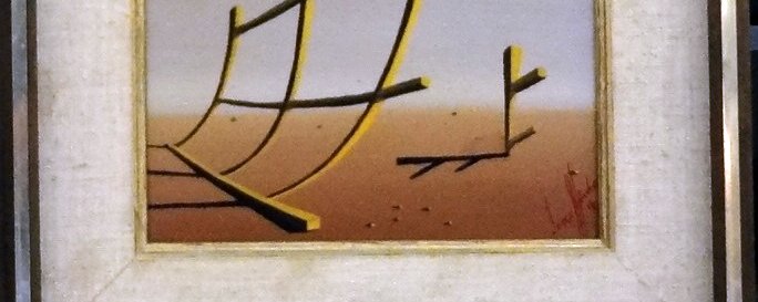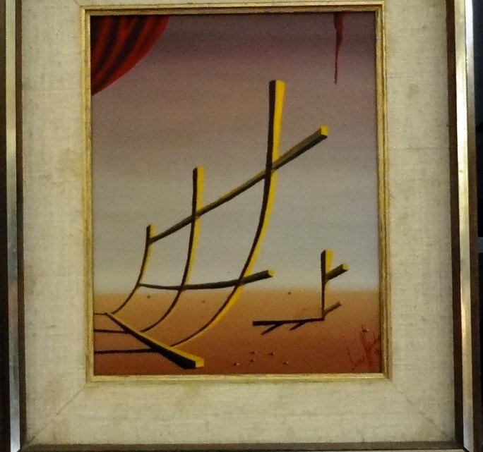 Oleo sobre tela con un paisaje y unos palos amarillos en el horizonte. Dimensión es 8 por 10 pulgadas. Firmado en rojo en la parte inferior derecha. Sin marco.