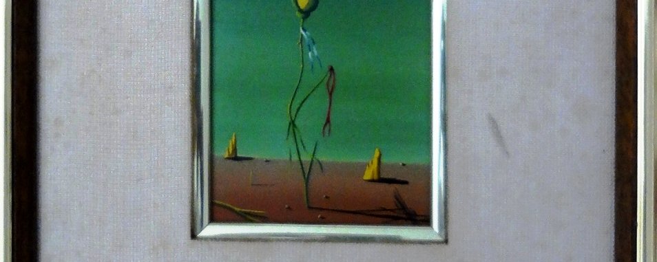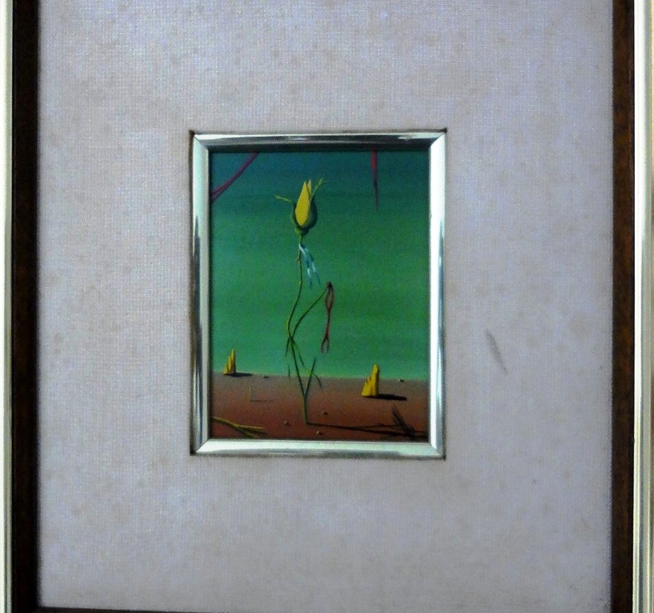 Oleo sobre carton de pequeño formato con una flor amarilla en el horizonte. Dimensión es 3.5 por 4.5 pulgadas. Firmado en la parte inferior derecha. Sin marco.