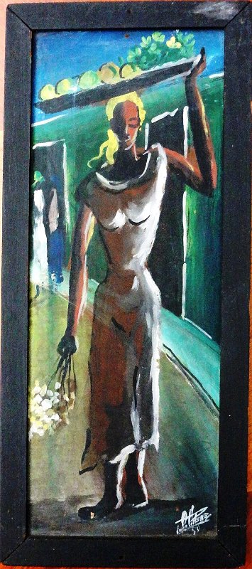 DSC00777 Two watercolor on board showing a man and a woman in a rural area. Dimension is 5 by 13.5 inches. Signed and dated in white the lower right side. Conjunto de dos acuarelas sobre carton con un hombre y una mujer. Dimension es 5 por 13.5 pulgadas. Firmado y fechado en blanco en la parte inferior derecha.