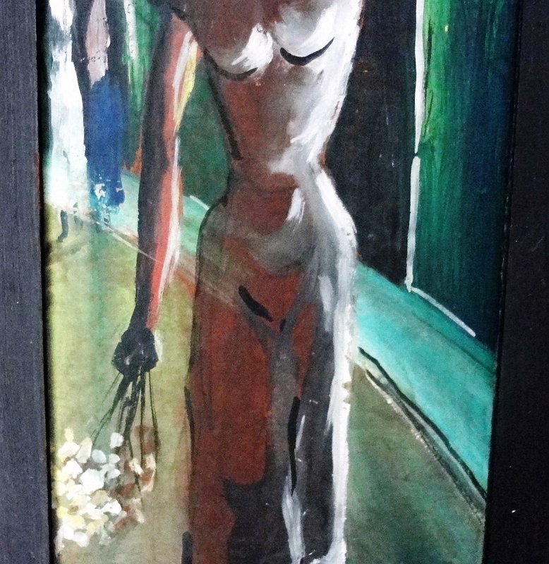 DSC00779 Two watercolor on board showing a man and a woman in a rural area. Dimension is 5 by 13.5 inches. Signed and dated in white the lower right side. Conjunto de dos acuarelas sobre carton con un hombre y una mujer. Dimension es 5 por 13.5 pulgadas. Firmado y fechado en blanco en la parte inferior derecha.