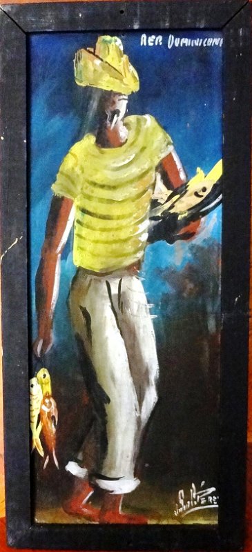 DSC00783 Two watercolor on board showing a man and a woman in a rural area. Dimension is 5 by 13.5 inches. Signed and dated in white the lower right side. Conjunto de dos acuarelas sobre carton con un hombre y una mujer. Dimension es 5 por 13.5 pulgadas. Firmado y fechado en blanco en la parte inferior derecha.