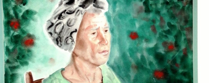 Excellent watercolor on paper portrait painting with an old seated woman with the titled "Doña Bolola Sentada" (Seated Mrs. Bolola). Paper dimension is 28 by 38 inches. Signed in the lower left side and dated 1987. No frame.