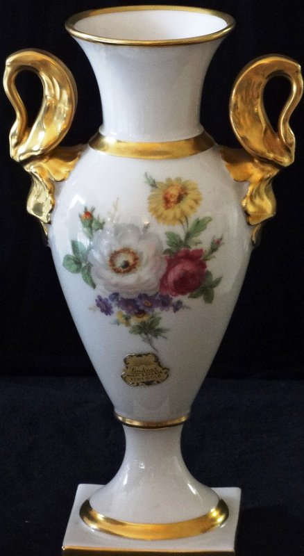 Lidner with a hand painted in light brown color, flowers in the center and gold handles, and a size of 10 inches high. Lidner de color crema pintada a mano con centro de flores y asas en dorado, y un tamaño de 10 pulgadas de altura.