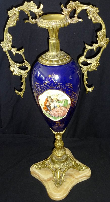 Large in a classical blue color with a romantic scene in the center, and handles and base in bronze, and with a base in brown marble, and with a large size of 22 inches high. Grande de color azul clásico, con una escena romántica en el centro, y las asas y base en bronce con mármol, y un gran tamaño de 22 pulgadas de altura.