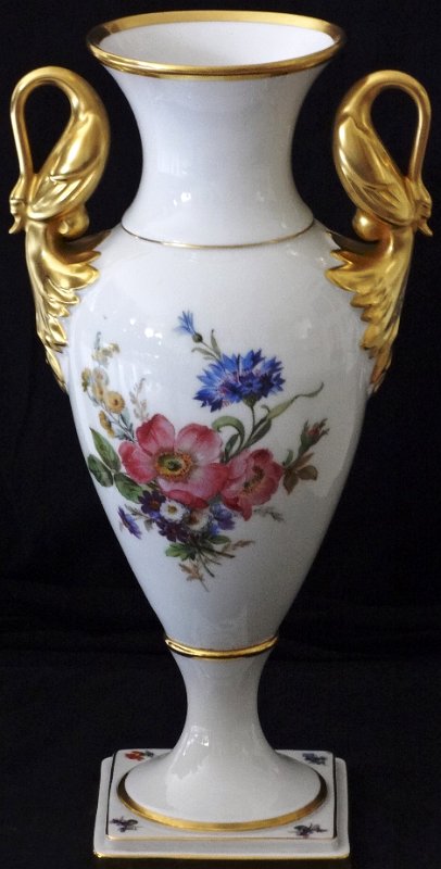 Alka Kunst with a hand painted in light brown, the center with flowers and gold handles, and with a size of 14 inches high. Alka Kunst de color crema con el centro pintado a mano con flores y asas en dorado, y un tamaño de 14 pulgadas de altura.