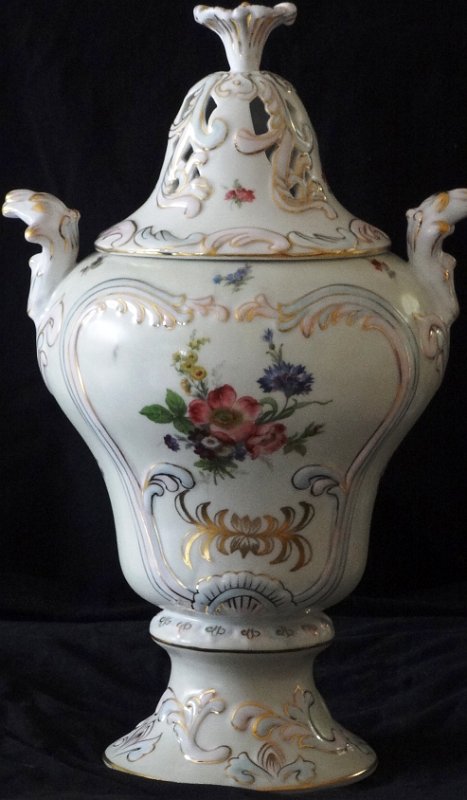 KPM a hand painted in light green and flowers, and with a size of 14 inches high. KPM pintada a mano en color verde claro con decoración de flores, y un tamaño de 14 pulgadas de altura.