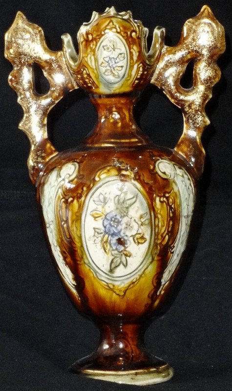 Hand painted in brown color with intricate gold handles and with a size of 6 inches high. Pintado a mano de color marrón con asas en dorado y un tamaño de 6 pulgadas de altura.