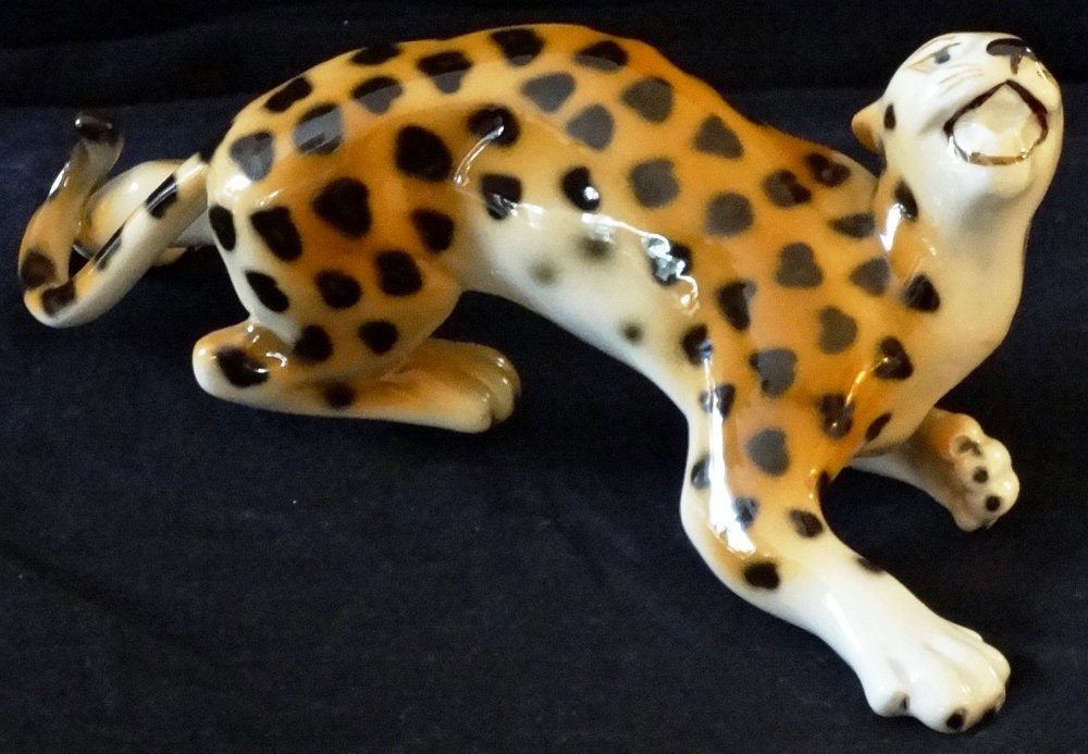 Royal Dux with a small hand painted orange colored leopard looking upwards and with a size of 4 inches long. Royal Dux con un leopardo de color anaranjado mirando hacia arriba y gruñendo con un tamaño de 4 pulgadas de largo.