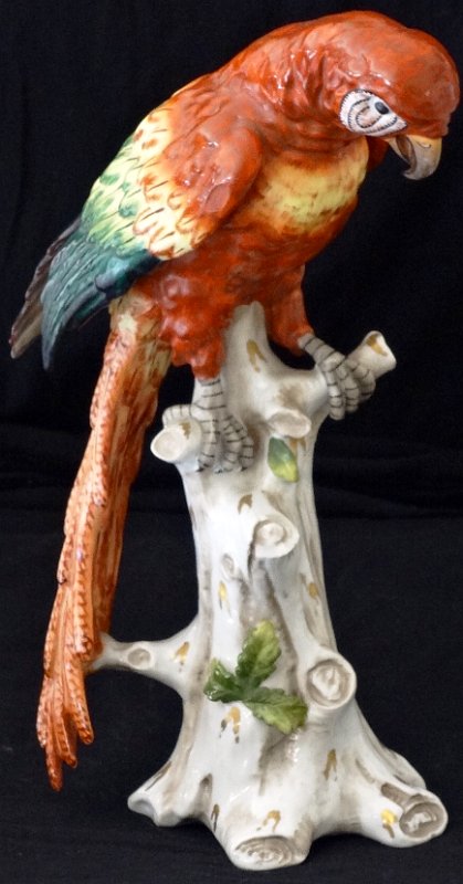Dresden with a red and green hand colored parrot on top of a tree branch and with a size of 12 inches high. Dresden con una cotorra sobre un tronco coloreada a mano en rojo y verde, y con un tamaño de 12 pulgadas de alto.