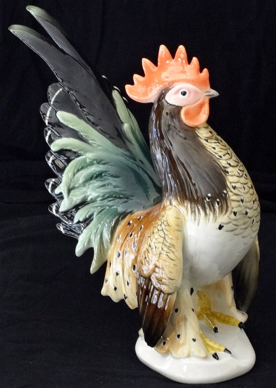 Karl Ens with a brown and green hand painted large cock bird, and with a size of 8 inches long and 12 inches high. Karl Ens con un gallo de color marrón y verde, y con un tamaño de 12 pulgadas de alto por 8 pulgadas de largo.