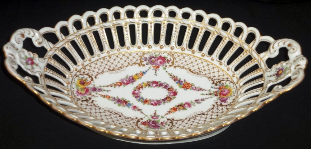 Dresden oval interlaced with handles and decorated in gold and flowers in the center and in the sides, with 12 inches long. Dresden entrelazada, con asas y decoración a mano en dorado y flores en el centro y lados, con un tamaño de 12 pulgadas de largo.