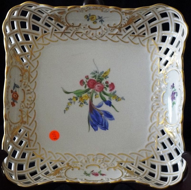 Miessen square hand decorated with flowers inside and on the sides, with gold borders, with a size of 8 inches in diameter. Miessen cuadrado con decoración a mano de flores dentro y en los lados, bordes dorados, y con un tamaño de 8 pulgadas de diámetro.