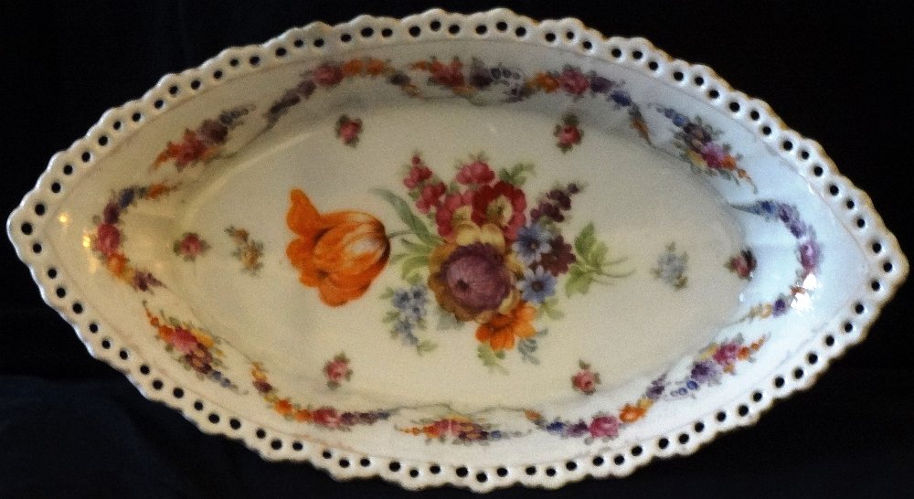 Schumann Bavaria oval hand painted in gold and flowers, with a size of 11 inches long by 6 inches wide. Schumann Bavaria ovalado pintado a mano en dorado y flores, con un tamaño de 11 pulgadas de largo por 6 de ancho.