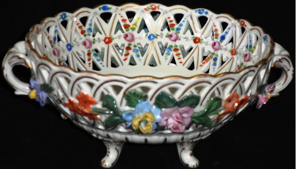 Dresden round with handles and decorated with flowers in relief, with a size of 12 inches in diameter. Dresden redondo con asas y decoración de flores en relieve, y un tamaño de 12 pulgadas de diámetro.