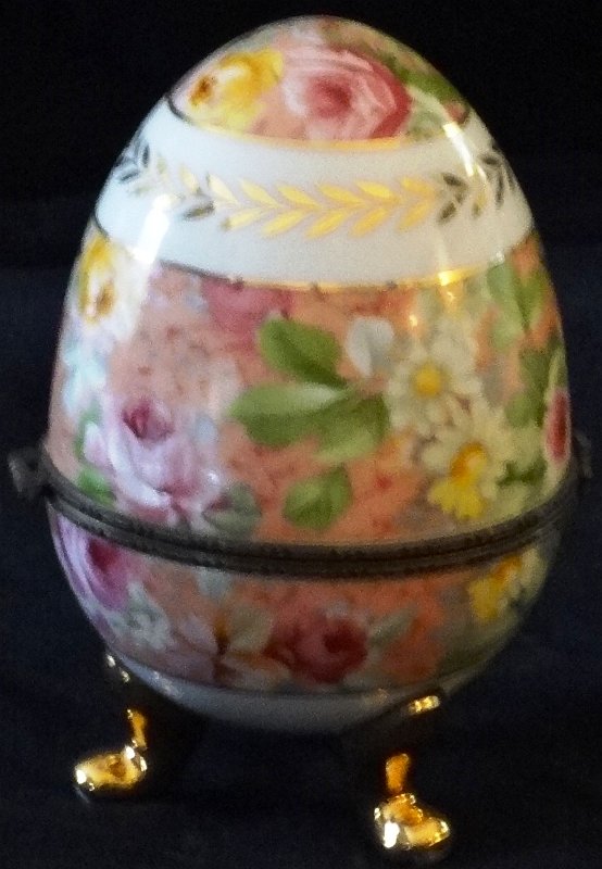 Limoges a hand painted egg in pink with touches of green and gold legs, with a size of 4 inches high. Limoges en forma de huevo pintado a mano de color rosado con toques verdes y patas en color oro, y un tamaño de 4 pulgadas de altura.