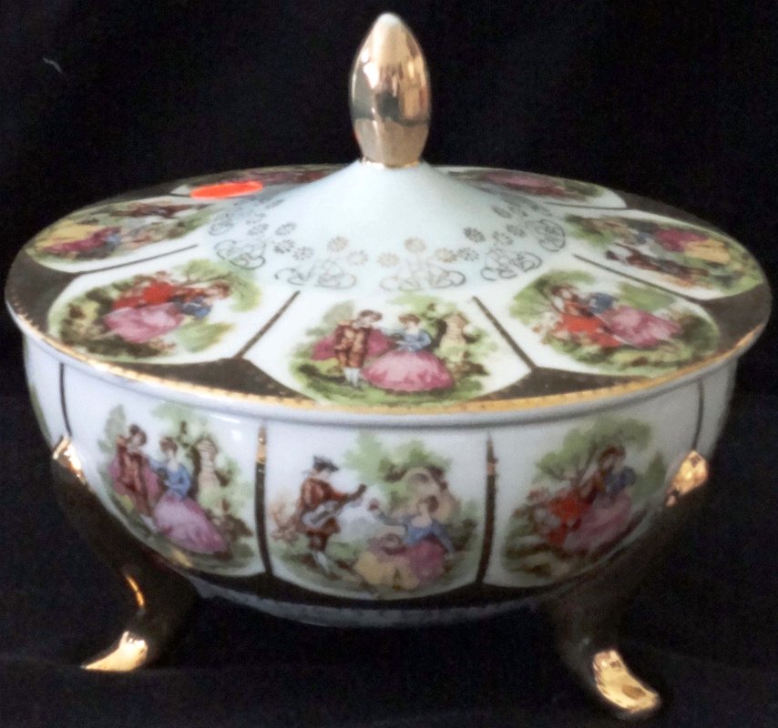 Sevres a hand painted scenes Fragonard style, with borders, legs and top in gold color, with a size of 5 inches in diameter. Sevres con escenas pintadas estilo Fragonard, y bordes, patas y tope en color dorado, y un tamaño de 5 pulgadas de diámetro.