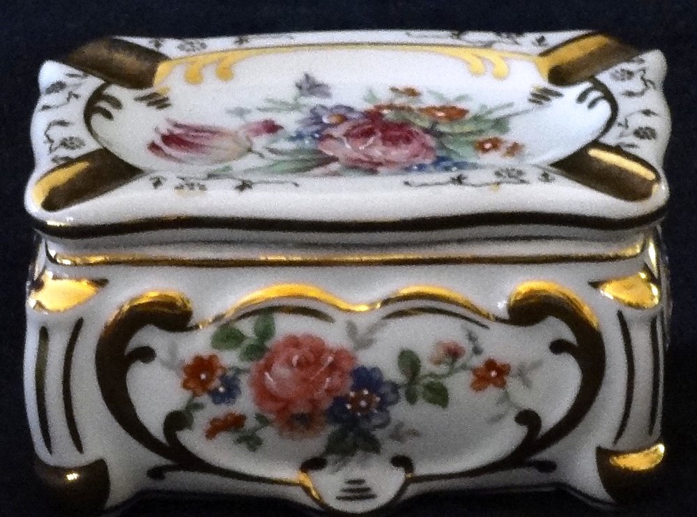Limoges a cigarette container and ash tray hand decorated with flowers and gold borders, with a size of 4 inches in diameter. Limoges un porta cigarrillos y cenicero con decoración a mano en de flores y bordes dorados, y un tamaño de 4 pulgadas de diámetro.