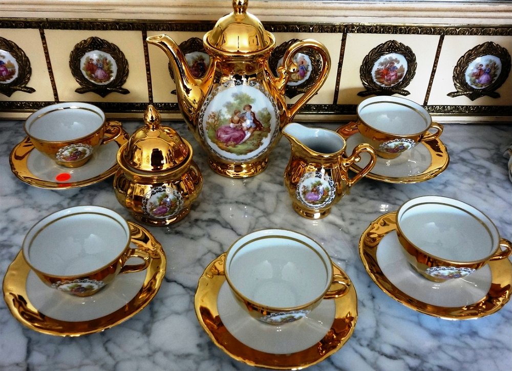 Horst Kuba Bavaria a set with five cups and plates, sugar and cream bowls, and tea or coffee pot, decorated in 24 Karat gold, and a romantic scene in the center. Horst Kuba Bavaria un juego de 5 tazas y platos para te o cafe con azucarera, cremera y cafetera, y una decoración en oro 24 kilates y escena romántica en el centro.