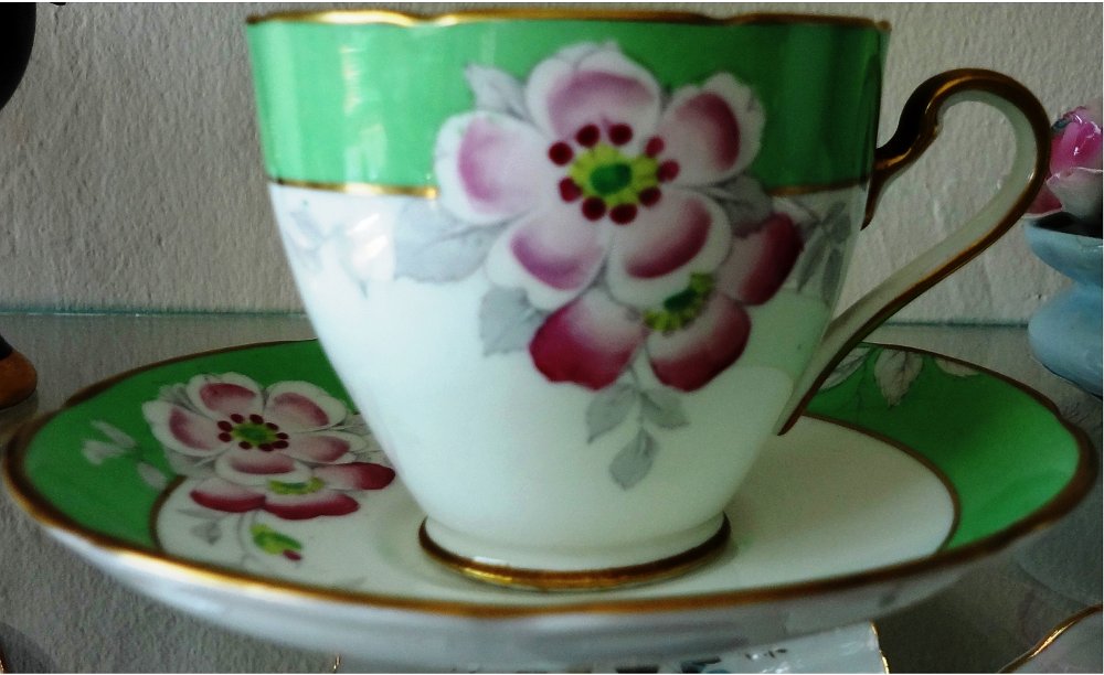 Gladstone a set with cup and plate decorated with pink flowers and green border, with a size of 4 inches in diameter. Gladstone un juego de taza y plato con una decoración en flores rosadas y borde verde, con un tamaño 4 pulgadas de ancho.