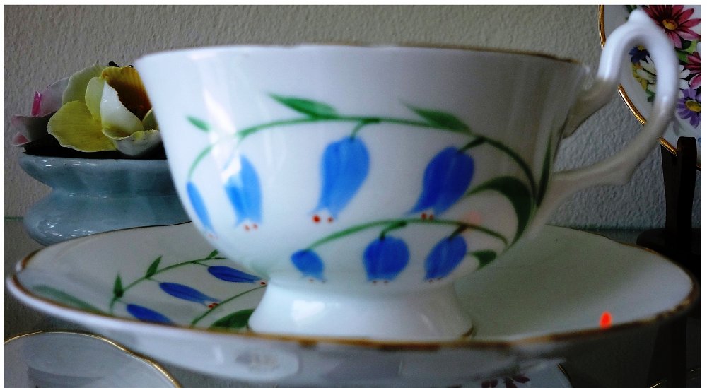 Alesbury a set with cup and plate decorated with blue and green flowers, with a size of 4 inches in diameter. Alesbury un juego de taza y plato con decoración en flores azules y verdes, y un tamaño de 4 pulgadas de ancho.